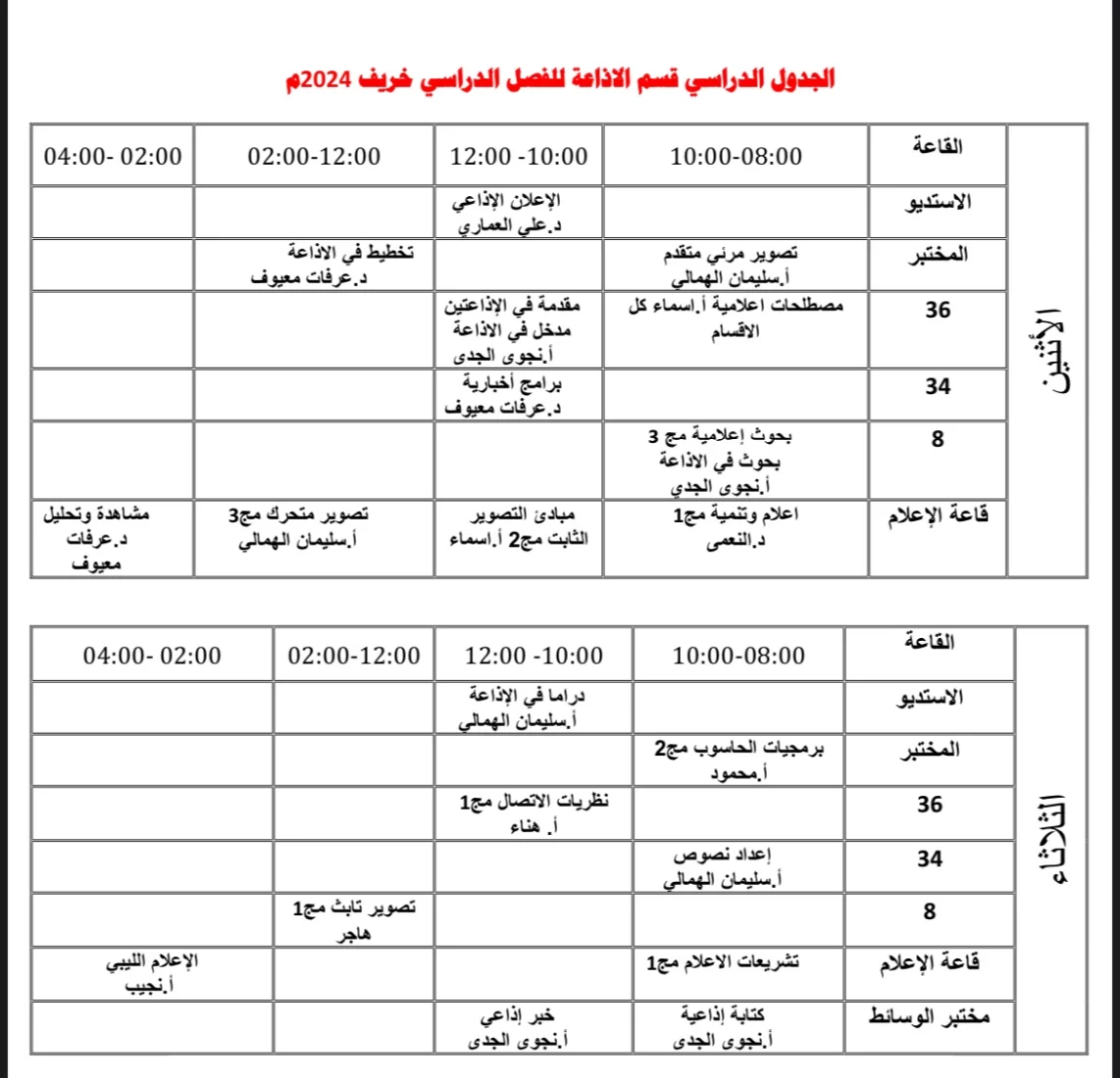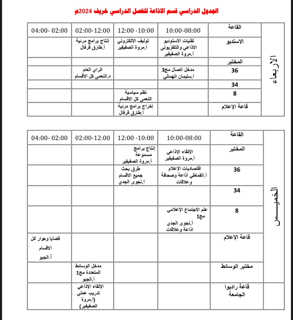 الجدول الدراسي لطلبة قسم الإذاعة والتلفزيون للفصل الدراسي 2024
