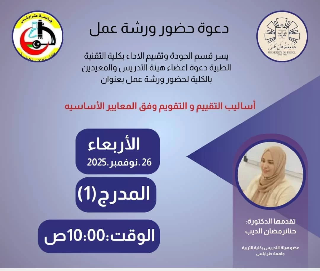 دعوة لحضور ورشة عملفي إطار التعاون المشترك بين كلية التقنية الطبية وكلية التربية – باب تاجوراء، يسرّ قسم الجودة وتقييم الأداء بالكلية دعوتكم لحضو