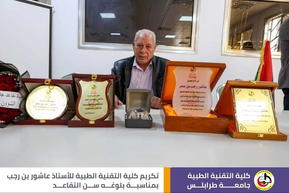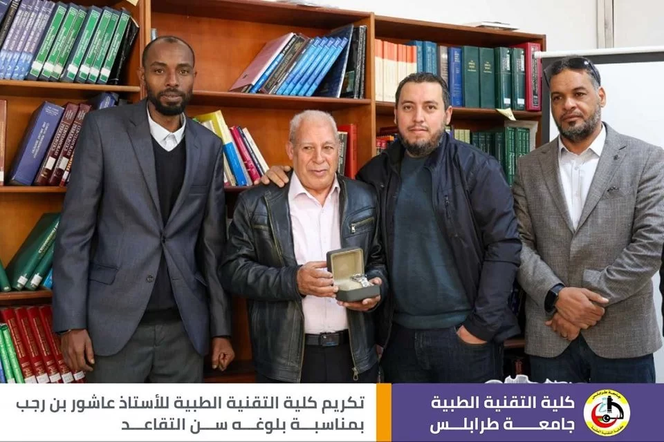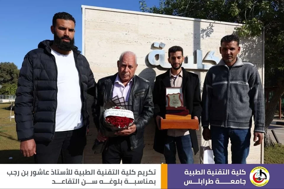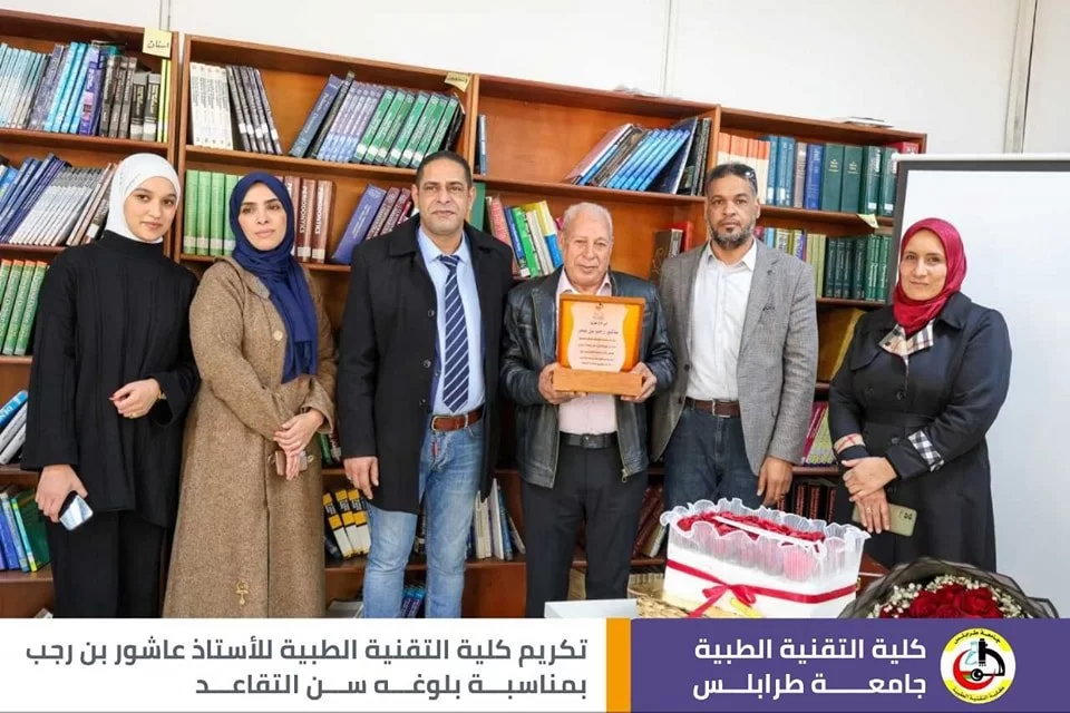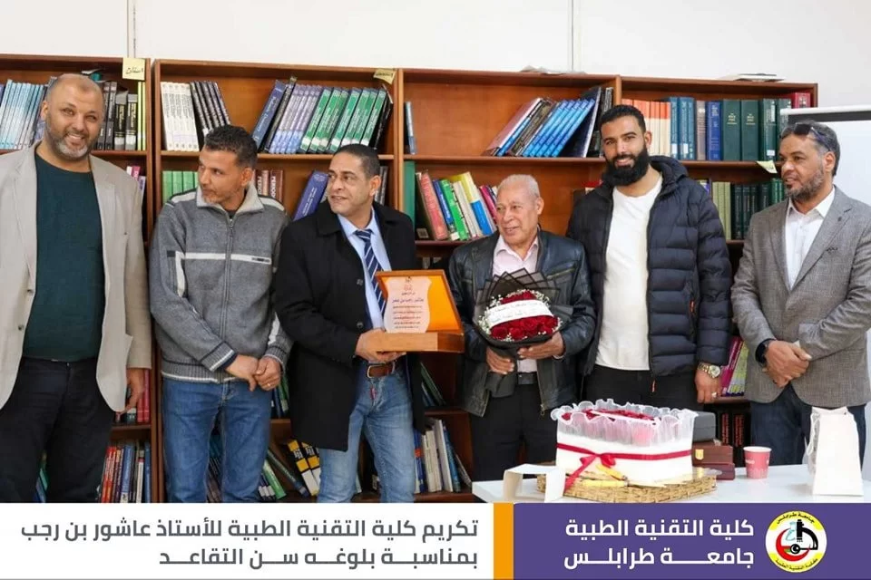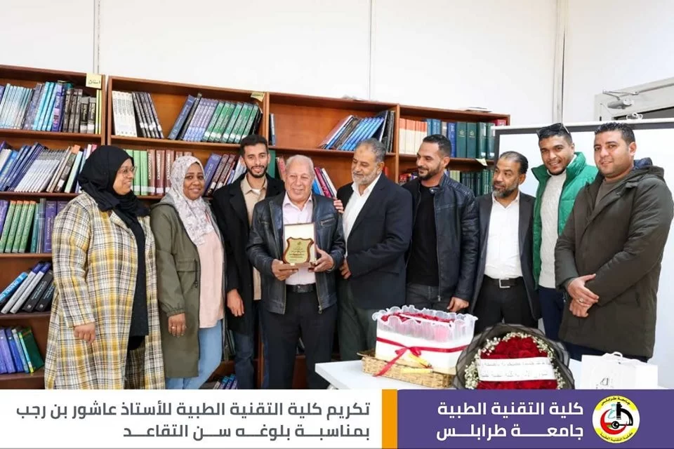 قال رسول الله صلَّ الله عليه وسَلَّم : (مَنْ صَنَعَ إِلَيْكُمْ مَعْرُوفًا فَكَافِئُوهُ، فَإِنْ لَمْ تَجِدُوا مَا تُكَافِئُونَهُ فَادْعُوا لَهُ حَتَّى تَرَوْا أَنَّكُمْ قَدْ كَافَأْتُمُوهُ). في أجواء تسودها المحبة والمودة أقامت كلية التقنية الطبية اليوم وبحضور عدد من الموظّفين وأساتذة الكلية حفل تقاعد وتكريم للموظف المميز في كلية التقنية الطبية أ. عاشور عمر بن رجب، وتخلّلَ الاحتفاليَّة كلمات ثناءٍ وإشادةٍ بالجهود التي قدمها طيلة فترة عمله في الكلية، نتمنى له موفور الصحة والعافية، وبارك الله فيه على جميع ما قدمه، متمنين له دوامَ التَّوفيق وحياة مملؤة بالعطاءِ والصَّحةِ.
