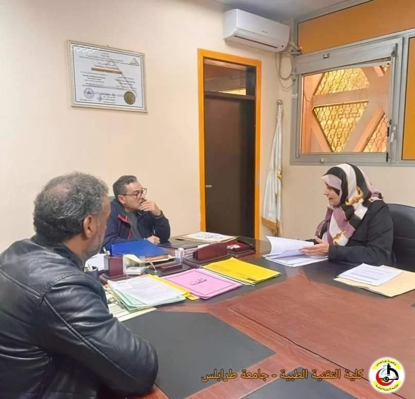 في إطار عمل وسعي كُليَّة التَّقنِيَّة الطَّبِّيَّة للحصول على الاعتماد البرامجي، عقد اليوم الاثنين الموافق 12/02/2024 عميد كُليَّة التَّقنِيَّة الطَّبِّيَّة السَّيد د.جمعة بن سليمان اجتماعا ضمِّ كُّلا من : رئيس قسم الجودة وتقييم الأداء بالكلية والسَّيِّدة د. أحلام الخشيبي ومدير الشؤون الإداريَّة والماليَّة للكليَّة السَّيَّد أ. عبد الله خلف الله، وقد خُصَّصَ الاجتماع لمناقشة التَّجهيزات لتقديم ملف الاعتماد البرامجي لكليَّة التَّقنِيَّة الطِّبِّيَّة إلى مركز ضمان الجودة خلال الأيَّام القادمة.