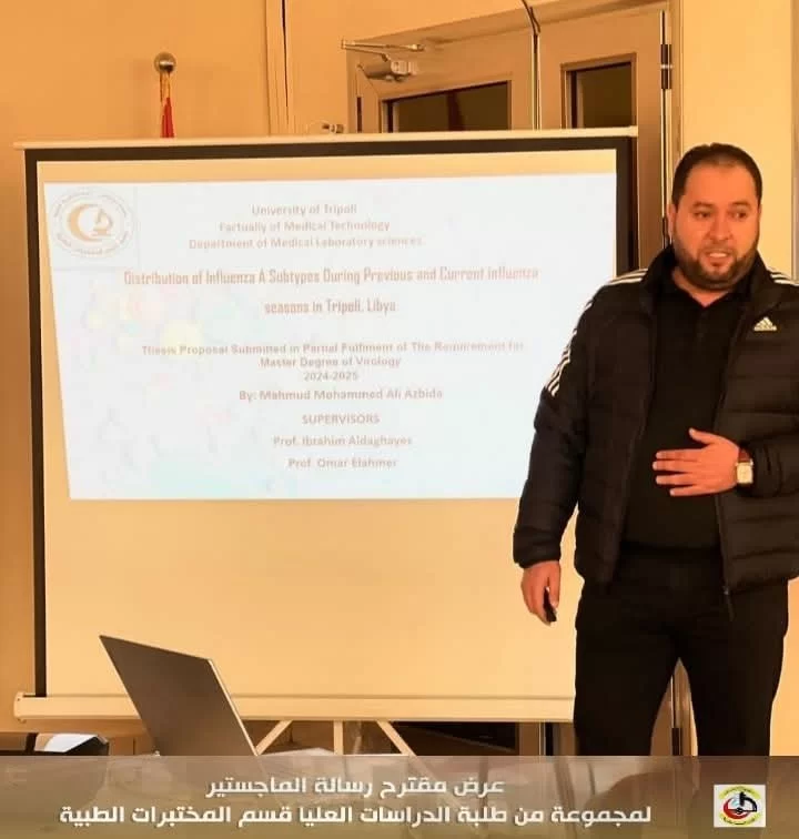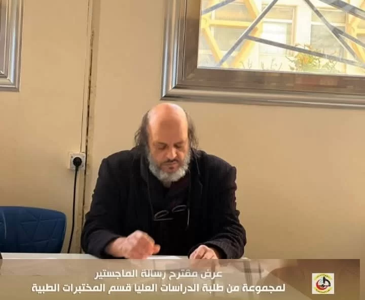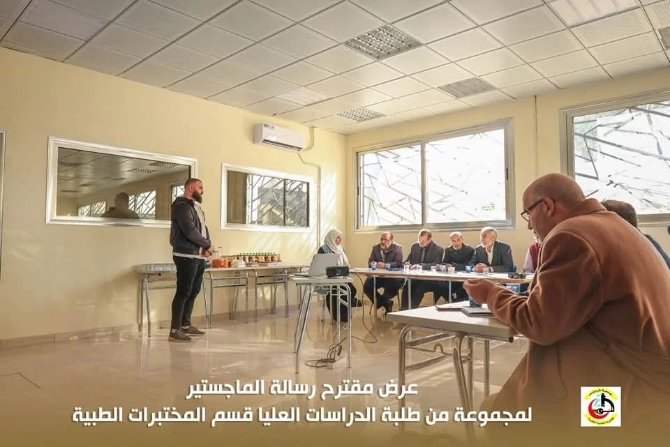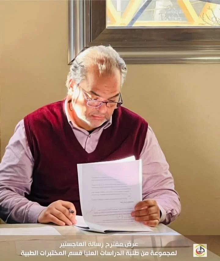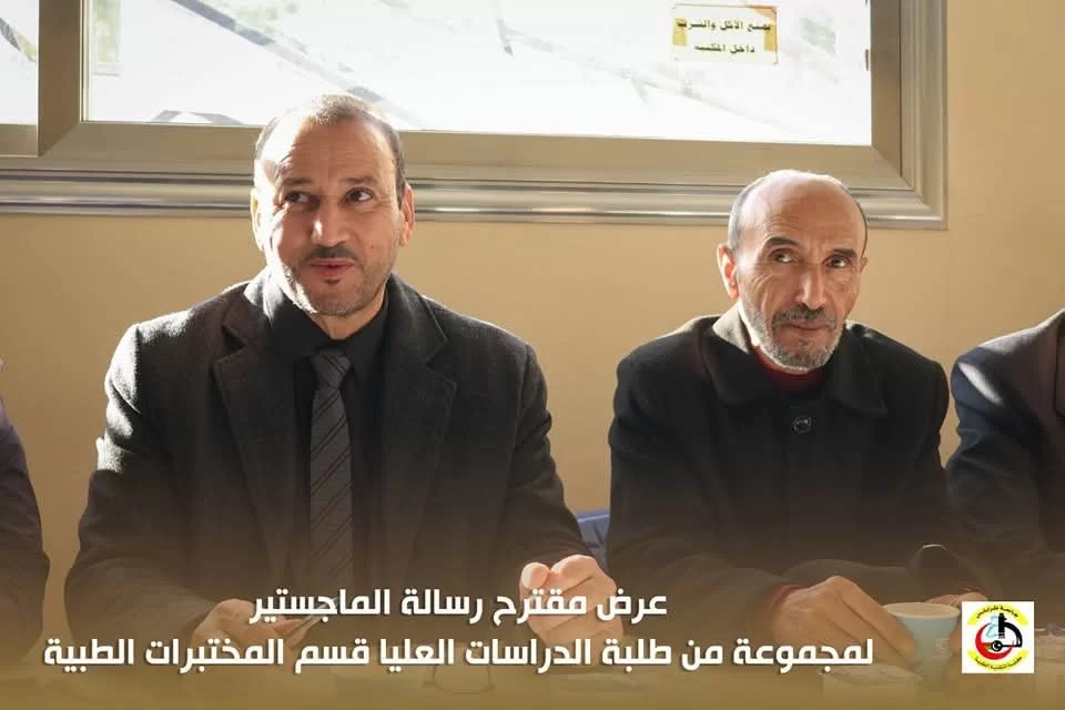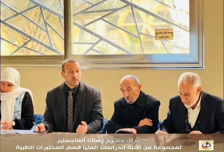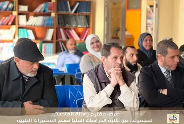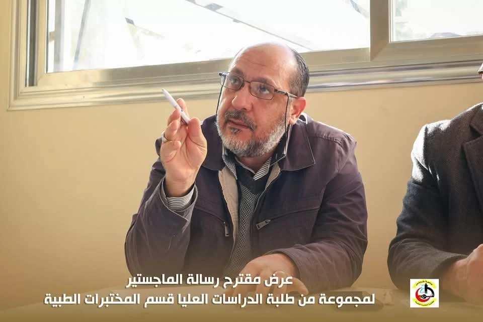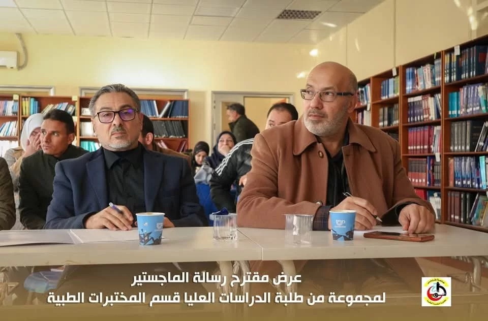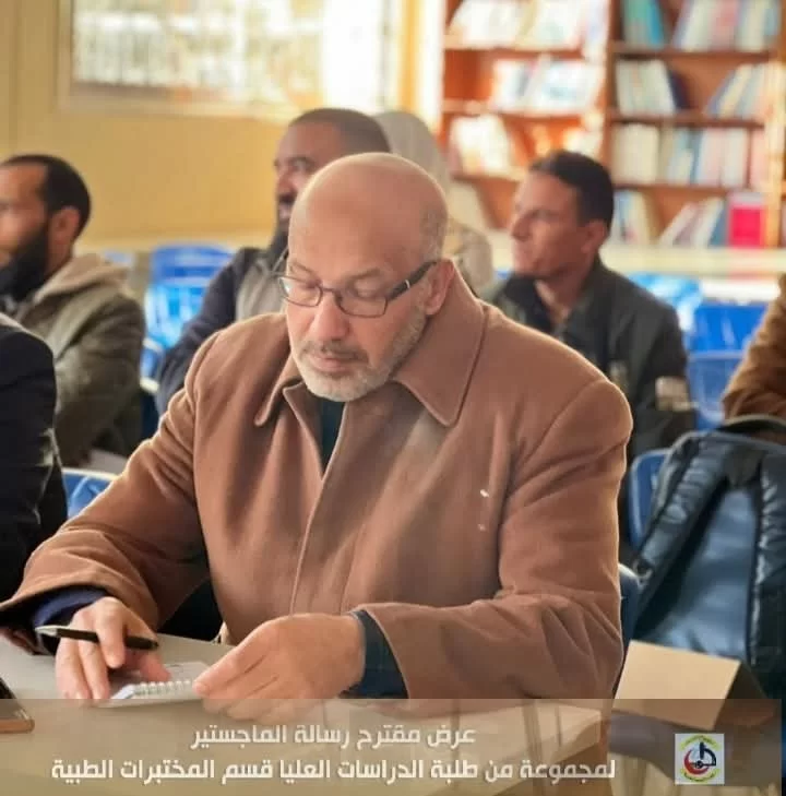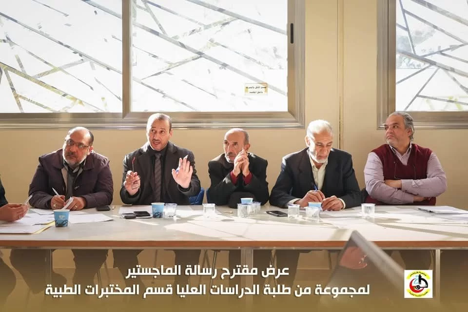 في إطار تقييم مقترحات رسائل الماجستير لطلبة الدراسات العليا بكلية التقنية الطبية، عُقدت اليوم الاثنين الموافق 20/01/2025 م جلسة تقديم وتقييم بعض مقترحات رسائل الماجستير المقدمة من طلبة الدراسات العليا قسم المختبرات الطبية بحضور عميد الكلية السَّيد/ د . جمعة بن سليمان والسَّيد / أ.د. مدير مكتب الدراسات العليا بالكلية أ.د.بدر الدين النجار ، بالإضافة إلى اللجنة المشكلة لهذا الغرض .
