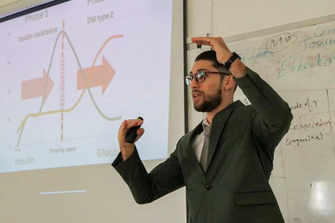 نظم قسم الصحة العامة اليوم الاثنين الموافق 2025/12/01 عند الساعة العاشرة صباحاً محاضرة توعوية مميزة حول مقاومة الأنسولين قدّمها المحاضر أحمد عليوة، وذلك بحضور أعضاء هيئة التدريس والطلبة المهتمين من قسم الصحة العامة والكلية.