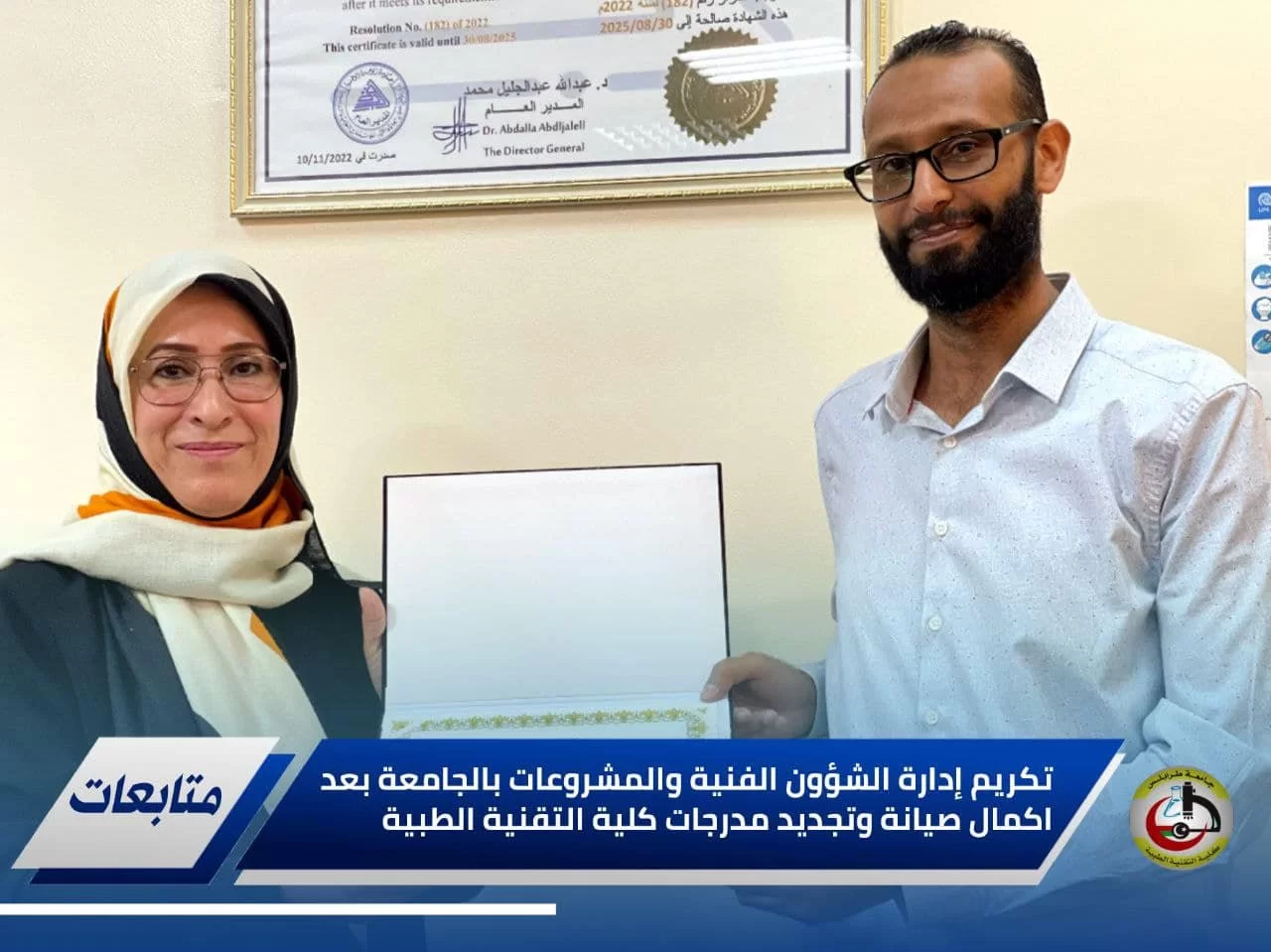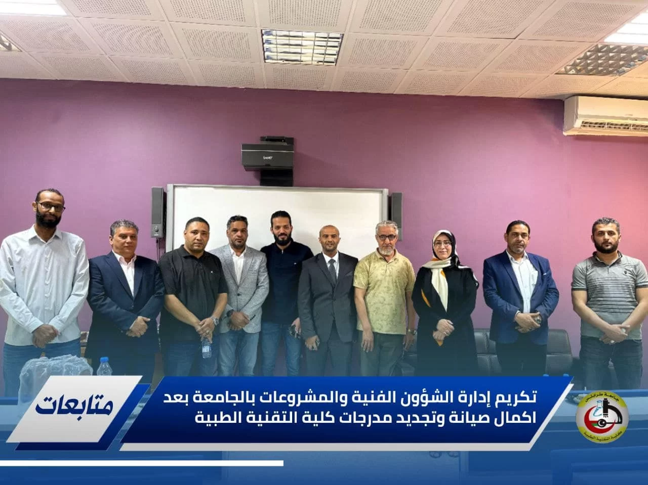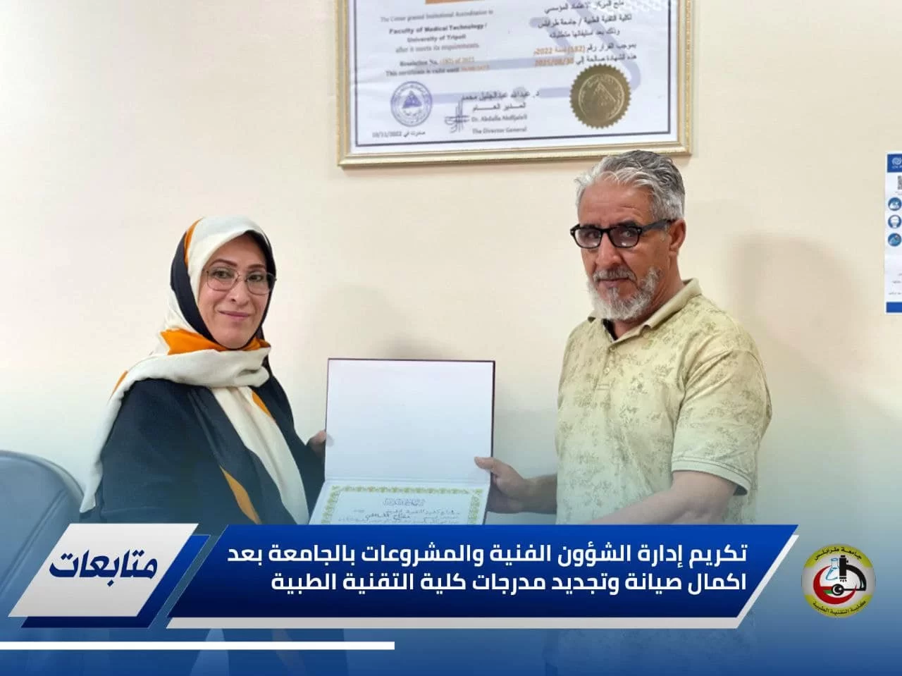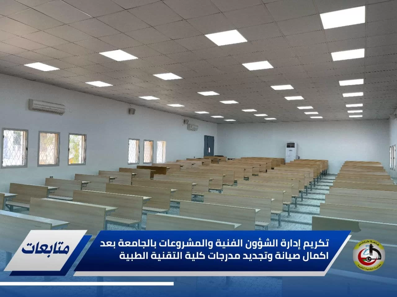 تم الانتهاء من تحسين المنظر الجمالي للكلية وكدلك الانتهاء من صيانة المدرجات بها ومن هنا حرصت ادارة الكلية المتمثلة في عميد الكلية ا.د عائشة قشوط والسادة مدراء المكاتب والادارات ورؤساء الاقسام.. يسر إدارة الكلية أن تتقدم بكل آيات الشكر والعرفان إلى مدير إدارة الجامعة بالجامعة / محمود المصراتي و م .عرفه الفرجاني ورئيس لجنة المدرجات بالجامعة السيد / .. عادل حسين تقديرًا لهم على عظيم جهودهم التي بذلوها بكل إخلاص في إنجاز العمل من أجل الكلية ، شاكرين لهم حرصهم على إنجازه بالشكل ، فبارك الله فيهم ووفقهم لما فيه خير الجميع