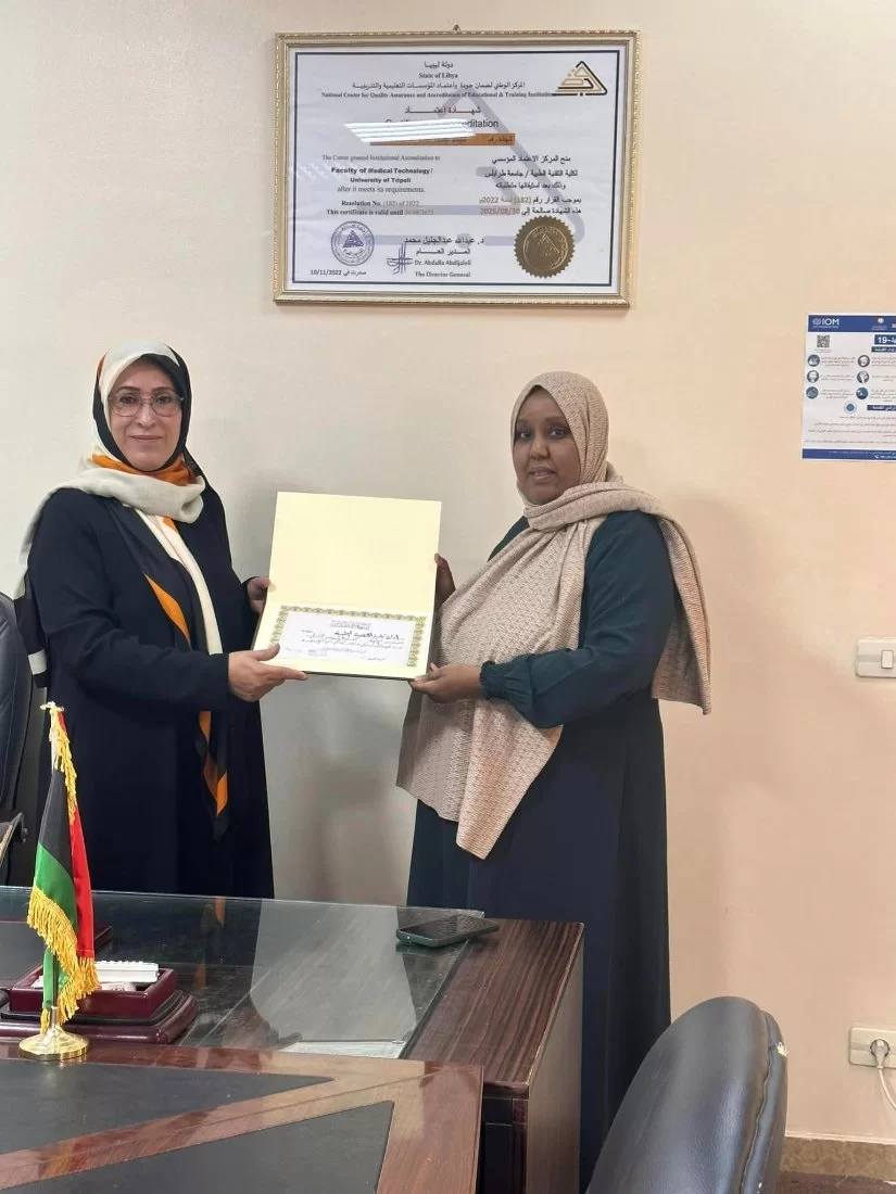 في لفته كريمة من السيدة ا.د.عائشة قشوط عميد الكلية حيث قامت بتكريم السيدات: ا. فاطمة موسى محاسبة الكليه ا. فتحية المبروك. رئيس وحدة الخريجين بالكلية ا . امال التارقي. وحده الخزينة بالكلية وذلك لتفانيهم في عملهم وحرصهم علي ان يكون في احسن صوره وهدا التكريم يعكس حرص ادارة الكلية تكريم المتميزين في عملهم فهنيا لكلية التقنية الطبيه بمثل هؤلاء السيدات المتميزات