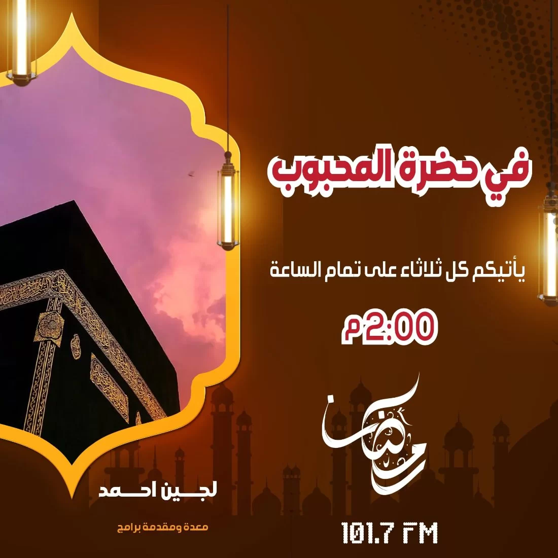 لما تجلى شعّ نور ..والوجود به احتفى ..تالله ما بين البرايا ..كالحبيب المصطفى ..طوبى لمن صلى عليه ..محبة وبه اقتفى ..سيرة الحبيب صلوات الله وسلامه عليه نسردها عليكم في برنامج في حضرة المحبوب مع "لجين أحمد" يأتيكم كل ثلاثاء على تمام الساعة 02:00 ظهراً.على أثير الجامعة 101.7FMكونوا في
