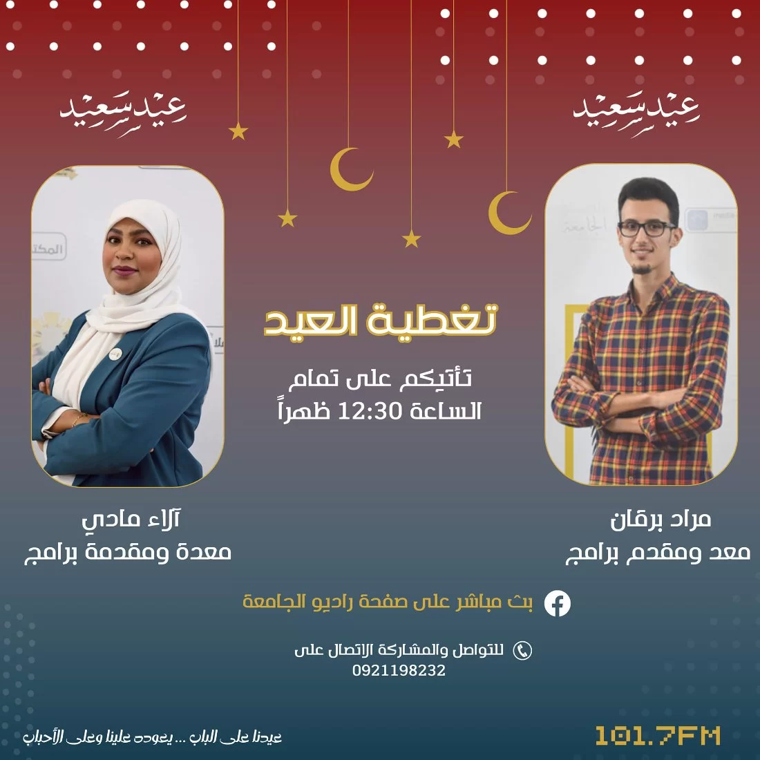 زي ماعودناكم ووعدناكم إنّ في كل مناسبة حلوة نعيشوا تفاصيلها معاكم، اليوم كانت تغطية العيد من راديو الجامعة مع"مراد برقان وآلاء مادي" متميزة رفقة المتألق راسم البسمة على وجوه الناس المكافحة الإعلامي "أسامة الزياني".تطرقنا بالحديث عن تفاصيل برنامج العاطي حيوآلية التقصي المتبعة من قب