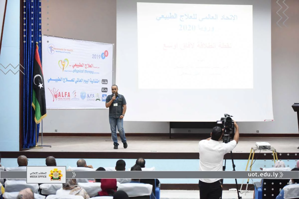 نظم مجلس تخصصات العلاج الطبيعي صباح اليوم الاحد الموافق الثامن من سبتمبر 2019،بمسرح كلية الهندسة جامعة طرابلس ،احتفالية باليوم العالمي للعلاج الطبيعي ،حيث يمثل هذا اليوم وحدة وتضامن مجتمع العلاج الطبيعي العالمي وفرصة للتعرف على العمل الذي يقوم به ممارسي المهنة لمرضاهم ومجتمعهم.وقد حضر الاحتفالية "د. محمد السيد" عميد كلية التقنية الطبية جامعة طرابلس ،ووكيل الكلية "عبد الرزاق وريث" ،"د. عزيزة عبد السميع "رئيس قسم العلاج الطبيعي بالكلية ،و "د . محمد عبد الرحيم "عميد كلية التربية البدنية ، رئيس مجلس تخصصات العلاج الطبيعي "د. علي الشعافي". حيث ألقى محاضرة بعنوان " رؤيا 2020التي تساهم في تطوير مهنة العلاج الطبيعي أكاديميا وسرسريا".كما تهدف هذه الاحتفالية لإحياء اليوم العالمي للعلاج الطبيعي والتعريف بالاتحاد العالمي للعلاج الطبيعي وآلية الانضمام إليه، وجمع الأخصائيين والمعنيين بالقضايا المطروحة في الاحتفالية لمناقشة سبل تطور مهنة العلاج الطبيعي في ليبيا ،والتأكيد على أهمية ارتباط تخصص العلاج الطبيعي بالتخصصات الطبية الاخرى ، بالإضافة إلى الاهتمام بالأفكار الجديدة والمبادرات وتفعيل العلاقات من أجل تشجيع المشاركين على الاندماج في المجلس للتفاعل معه والاستفادة من خدماته.
