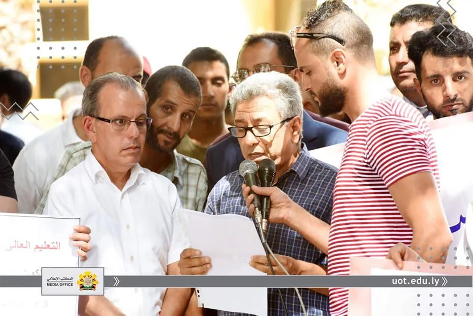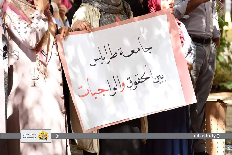 انطلاقا من أن مؤسسات التعليم العالي بكافة مكوناتها "أعضاء هيئة تدريس وموظفين" تعد من أهم ركائز المجتمع وأن توفير كافة الحقوق لهم دليل على رُقي المجتمع وتقدمه.ومن هذا المنطلق نظمت نقابتي موظفي وأعضاء هيئة التدريس جامعة طرابلس، صباح اليوم الأربعاء الموافق الثامن عشر من سبتمبر 2019م، وقفة احتجاجية أمام مقر رئاسة الجامعة، وذلك للمطالبة بزيادة مرتباتهم واعتماد جداول المرتبات المقترحة والمتوازنة مع الوظيفة والمؤهل والخبرة المتناسبة مع الوظائف الأخرى داخل الدولة الليبية والمحققة لميزان العدالة الاجتماعية.