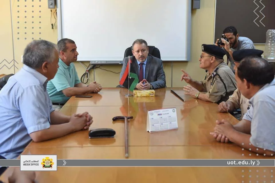 استقبل رئيس جامعة طرابلس "أ. د. نبيل النطاح" صباح اليوم الاثنين بمكتبه، مدير مديرية أمن طرابلس "العميد/أسامة عويدان" والوفد المرافق له ، وذلك بحضور "أ. د. عبد الرزاق العوزي" وكيل الكليات و "أ. محمد زيد " رئيس اتحاد طلبة جامعة طرابلس. جاءت هذه الزيارة لبحث سبل التعاون بين جامعة طرابلس ومديرية أمن طرابلس لخدمة المصلحة العامة ،والاطلاع على سير الامتحانات داخل الجامعة في ظل اتخادها لكافة الإجراءات الاحترازية والوقائية في سبيل الحفاظ علي الطلبة والكادر الوظيفي للجامعة، كما قام العميد "أسامه عويدان" بجولة تفقدية شملت كلية الطب البيطري اطلع من خلالها علي جاهزية المستشفى التعليمي والمرافق التابعة للكلية، وفي الختام تقدّم العميد بجزيل الشكر والتقدير والعرفان لجامعة طرابلس لجهودها المبذولة في استكمال العملية التعليمية للعام الحالي على أكمل وجه.