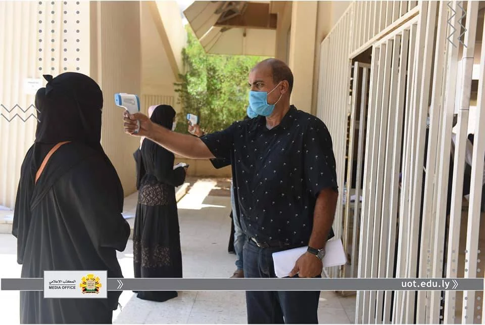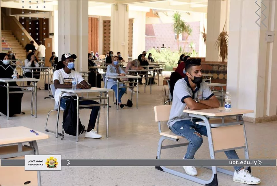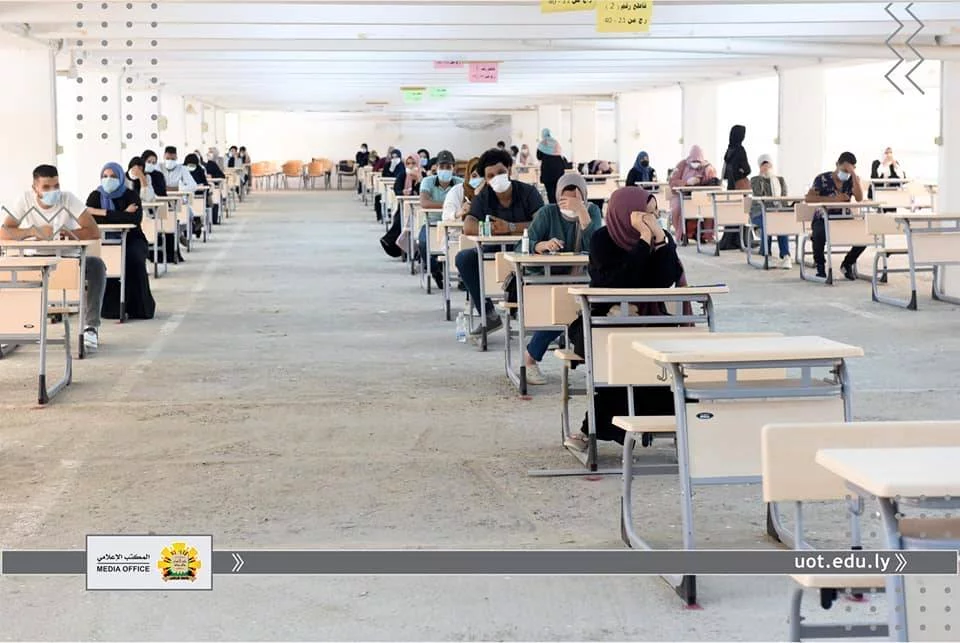 في إطار متابعة المكتب الإعلامي لجامعة طرابلس لسير الامتحانات النهائية داخل الجامعة، قامت عدسة المكتب يوم الثلاثاء الموافق للحادي عشر من أغسطس رفقة "أ. د. محمد السيد" عميد الكلية التقنية الطبية و "أ. أسامة حويته" مدير الشؤون الإدارية والمالية لكلية التقنية الطبية و "د. عبد الرؤوف الحاتمي" رئيس القسم العام ،برصد انطلاق الامتحانات النهائية للفصل خريف 2019م للقسم العام، والذي يعتبر من أكبر الأقسام في الكلية، حيث يصل عدد طلبة الي أكثر من 800 طالب وطالبة ،يتزامن ذلك مع اتباع كافة الإجراءات الاحترازية والوقائية من تعقيم واستعمال الكمامات والتباعد الجسدي.