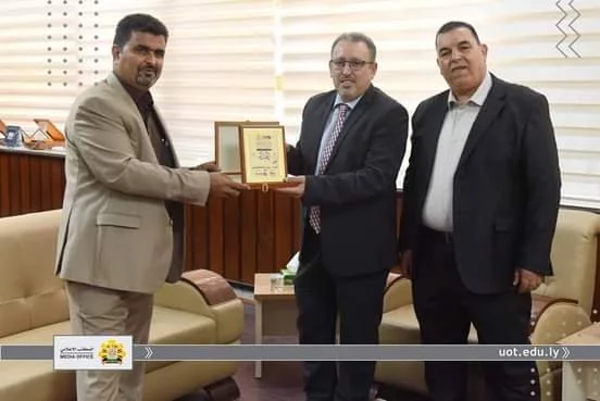 في اختتام فعاليات المؤتمر الدولي للغذاء والتغذية والمعرض المصاحب له، استقبل رئيس جامعة طرابلس "أ.د.نبيل النطاح" صباح اليوم الثلاثاء كل من "د.ابراهيم غريبي امحمد" رئيس المؤتمر و"د.ناجي الهادي أبوراس" رئيس اللجنة العلمية، حيث عبروا عن شكرهم وتقديرهم نيابة عن اللجنة التحضيرية العليا وكافة اللجان المنظمة للمؤتمر علي كل الدعم والتشجيع في سبيل انجاح المؤتمر واظهاره في أجمل صورة وأبهي حلة علي أمل استمرار التعاون المشترك في سبيل النهوض وتنظيم كافة المحافل العلمية، وفي ختام اللقاء تم تقديم درع وشهادة شكر وتقدير للسيد رئيس الجامعة.