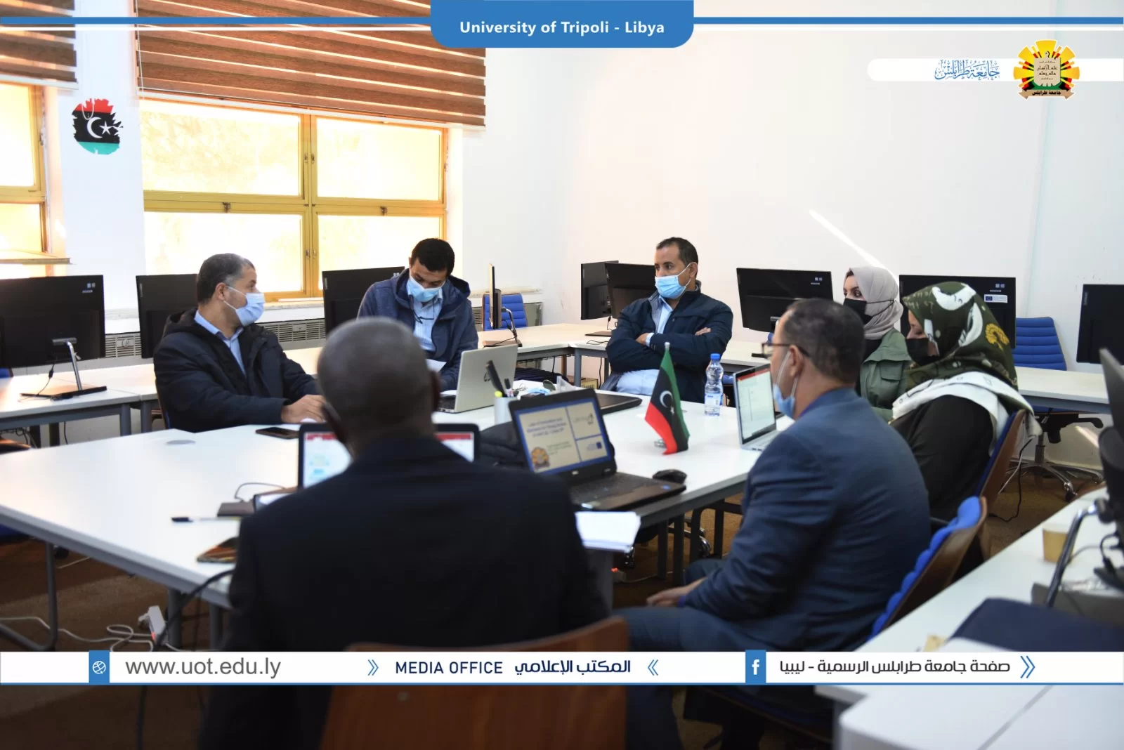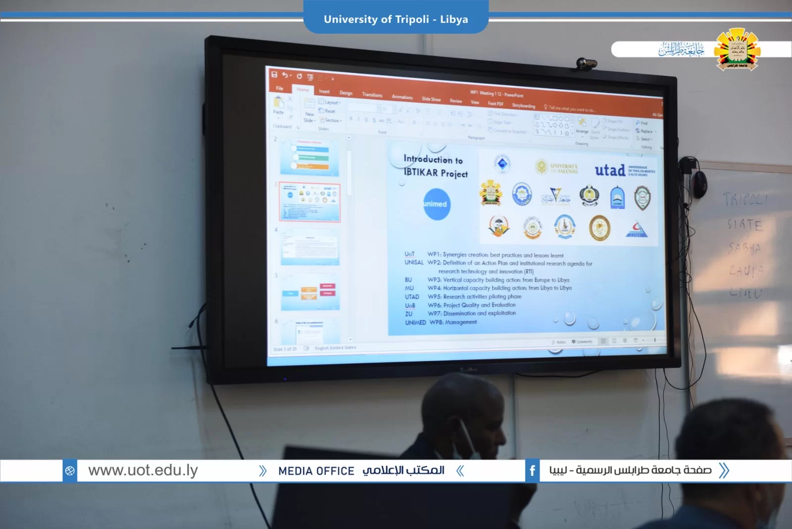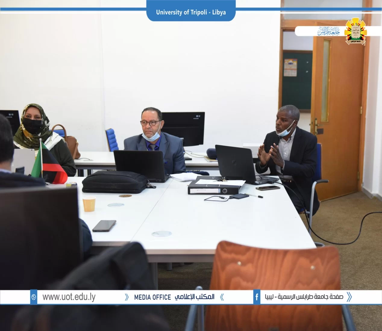 عُقد صباح اليوم الخميس الموافق 02/12/2021م بقاعة التواصل بمكتب التعاون الدولي بجامعة طرابلس زيارة ميدانية تقديمية لمشاريع بناء القدرات بجامعة طرابلس والمدعومة من وحدة المشروعات بالاتحاد الاوروبي. شارك في الزيارة السيد منسق مكتب ايراسموس د.علي باكير والسيد مدير المشروعات بالمكتب أ.د الصديق الشحومي ومن جانب جامعة طرابلس شارك فريق المكتب التعاون الدولي ومنسقو المشاريع بالجامعة تم عرض ملخص للمشاريع وشمل الأهداف والتحديات وإقتراح الحلول لمواجهة الصعوبات.
