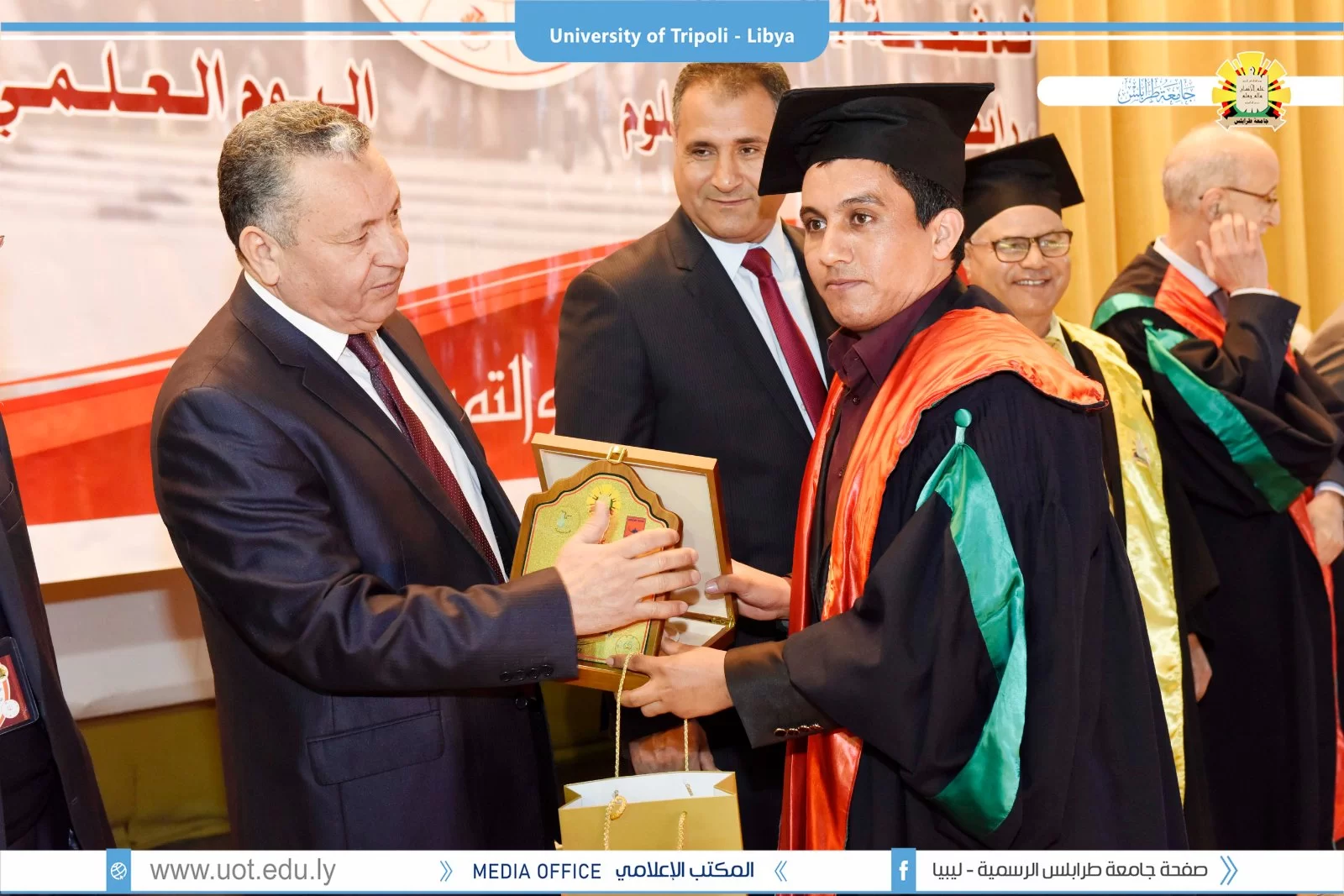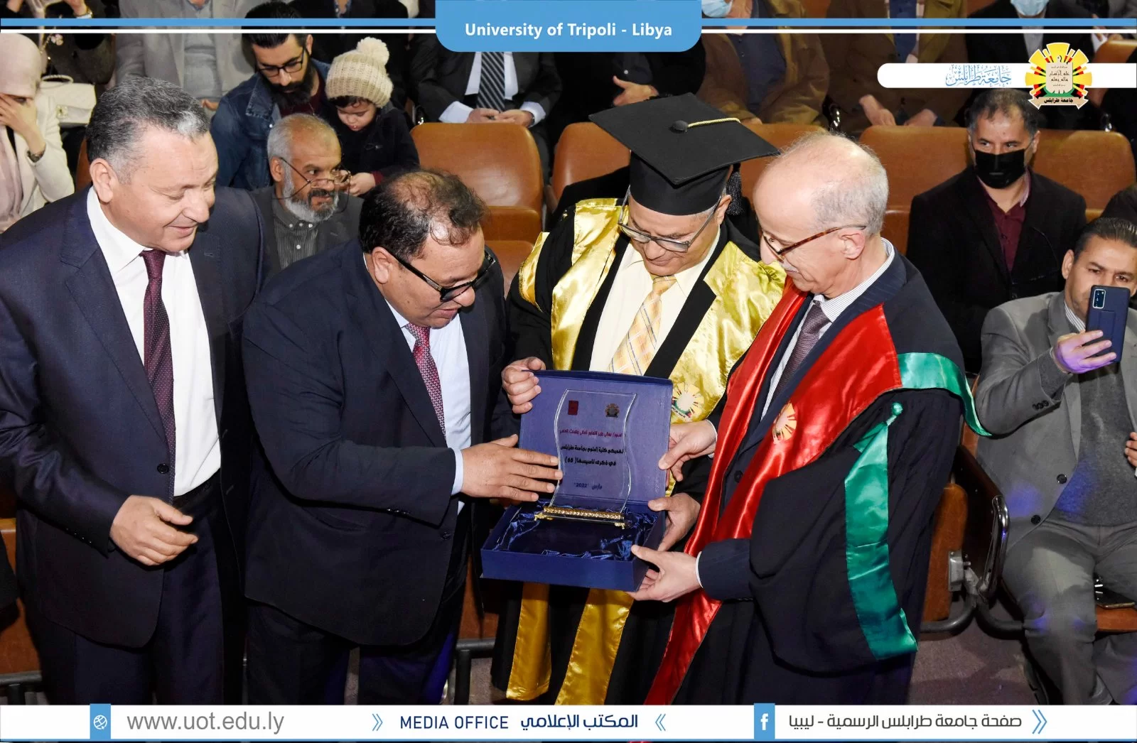 كلية العلوم تحتفل بالعيد الخامس والستين لإنشائها.طرابلس 21 مارس 2022م.أقيم صباح اليوم الإثنين بمسرح كلية العلوم إحتفالية بمناسبة العيد الخامس والستين لإنشاء كلية العلوم بجامعة طرابلس وقد حضر الإفتتاحية كلاً من السيد أ.د. عمران القيب وزير التعليم العالي والبحث العلمي والسيد وكيل وزارة البيئة والسيد أ.د. خالد عون رئيس جامعة طرابلس والسيد د. خالد غومة وكيل الجامعة للشؤون العلمية والسيد د. رمضان الجدي عميد كلية العلوم وعدد من عمداء الكليات وأعضاء هيئة التدريس والموظفي والطلبة بكلية العلوم.هذا وقد تم تكريم عدد من دفعات الكلية من حملة الماجستير والبكالوريوس.