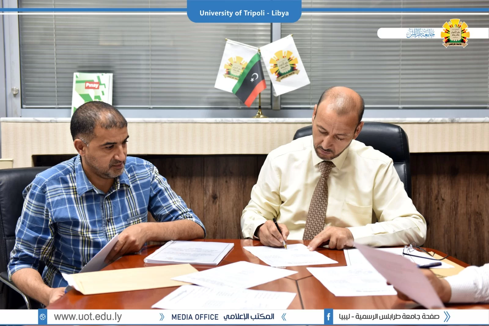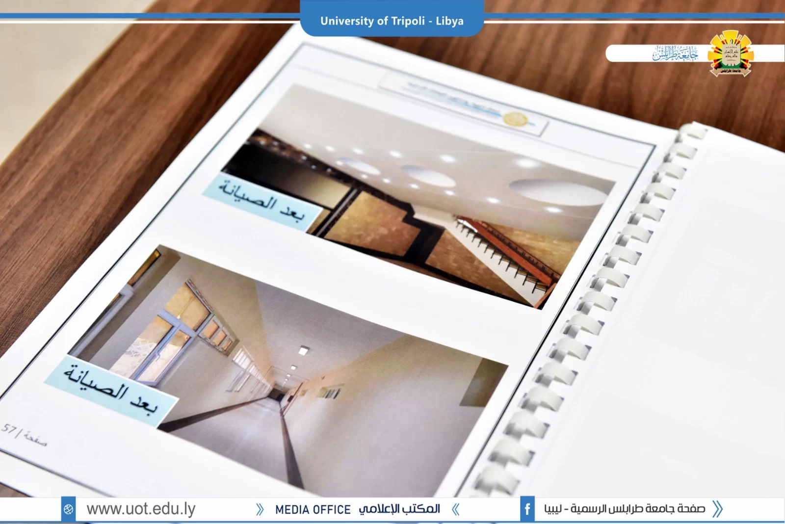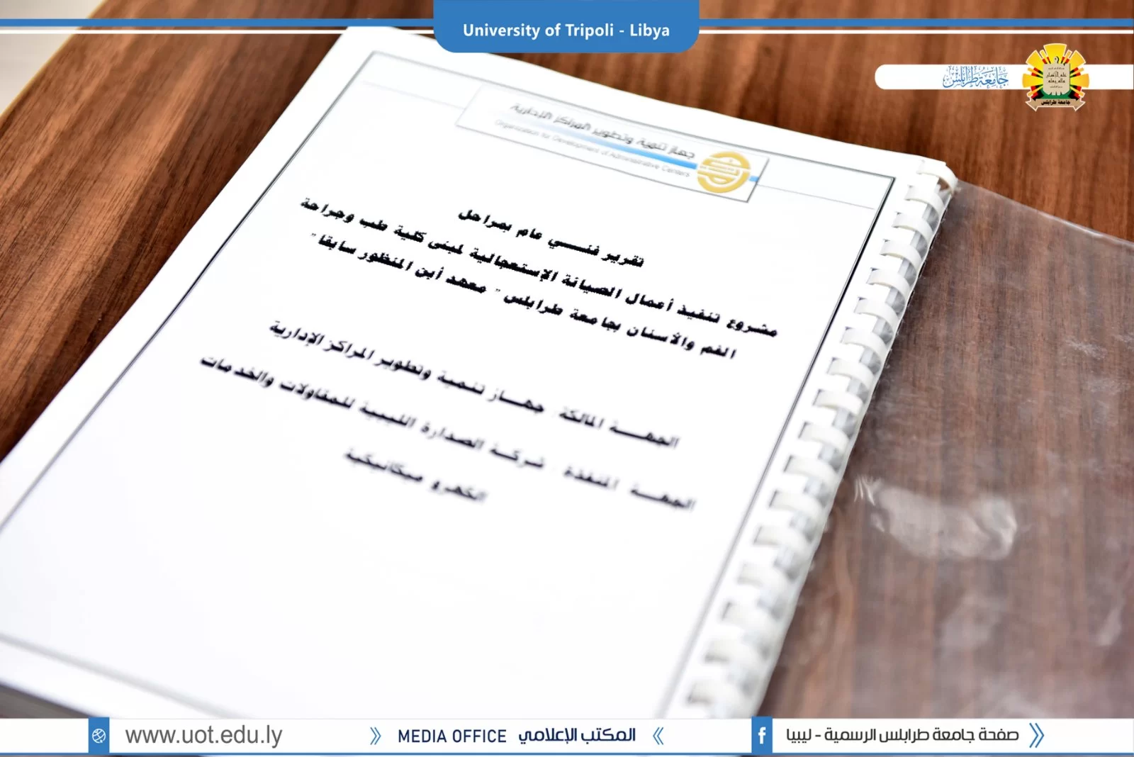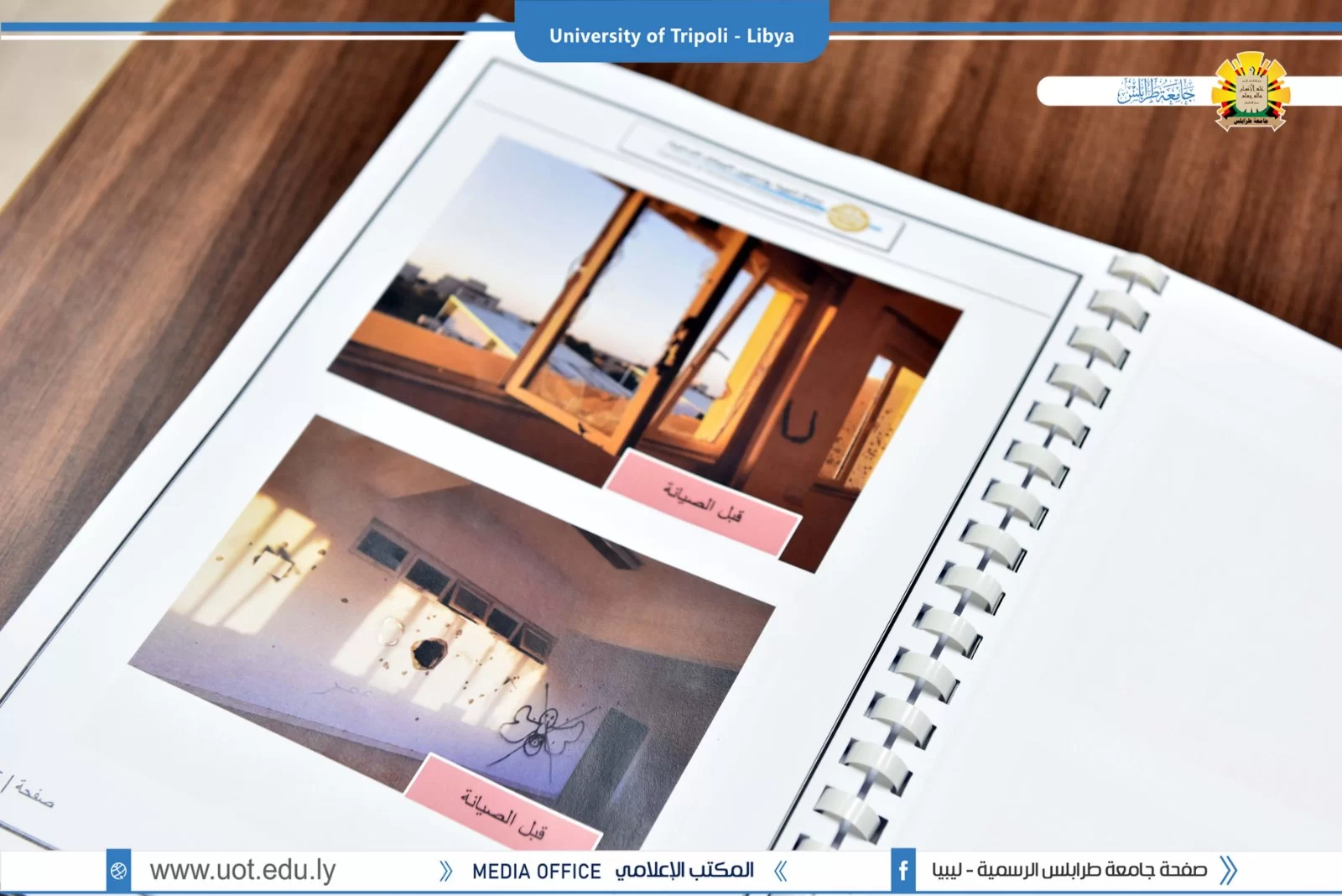 في إطار أعمال الصيانة النشطة داخل جامعة طرابلس تمت مساء اليوم 4/7/2022 مراسم تسليم و استلام مبنى كلية طب و جراحة الفم و الأسنان بجامعة طرابلس المتضرر من الحروب التي كانت سبب في تهالك المبنى داخلياً و خارجياً و ذلك بعد الإنتهاء من الصيانة الإستعجالية من قبل جهاز تنمية و تطوير المراكز الإدارية، بحضور السيد أ.د.صلاح الباروني وكيل الكليات الطبية بالجامعة و السيد د.صلاح الكردي عميد الكلية و السيد م.محمود المصراتي مدير إدارة الشؤون الفنية و المشروعات بالجامعة و السيد م.محمد العياشي رئيس لجنة تفعيل المشاريع بالجامعة.