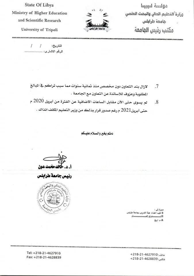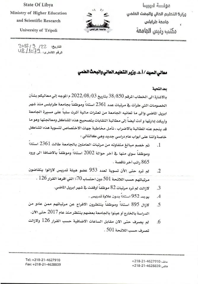 في ظل مايعانيه أعضاء هيئة التدريس والموظفين من تهميش لحقوقهم المشروعة والتي لطالما طالبوا بها طيلة الأعوام الماضية وحتى هذه اللحظة، متخدين في مطالبتهم الطرق المشروعة من اجتماعات مع مراكز صنع القرار تلاها عدة وقفات احتجاجية، موضحين فيها مطالبهم، وبعد دراسة تفصيلية للمشاكل التي يعاني منها أعضاء هيئة التدريس والموظفين بجامعة طرابلس قامت بها رئاسة الجامعة، تم إعداد خطاب موجه إلى معالي السيد/ أ.د. وزير التعليم العالي والبحث العلمي والمؤرخ في 03/08/2022 والمسجل برقم إشاري (38/850) بشأن استلام ومعالجة الكشوفات المحالة إلى وزارة المالية والمتعلقة بأسماء أعضاء هيئة التدريس والمعيدين والموظفين الذين لم يتم تعديل بياناتهم.ومنذ ذلك الحين وحتى يومنا هذا لم نرى معالجات واضحة وجذرية لهذه الإشكاليات، وبناءً على ما سبق قامت رئاسة جامعة طرابلس متمثلة في السيد رئيس جامعة طرابلس صباح اليوم بإعداد خطاب موجه إلى معالي السيد/ أ.د. وزير التعليم العالي والبحث العلمي والمسجل برقم إشاري (48/1079) بتاريخ 22/09/2022 مشاراً فيه إلى الخطاب السابق ذكره مطالباً فيه معالي وزير التعليم العالي والبحث العلمي بمخاطبة جهات الاختصاص لستوية هذه المشاكل خاصةً وأننا على أبواب عام دراسي جديد.