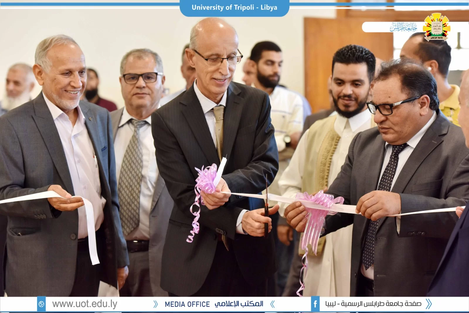 تم صباح اليوم الثلاثاء الموافق 27 سبتمبر 2022م بمبنى الكيمياء افتتاح مؤتمر التحديات و للمشاكل التي تواجه اللغة العربية تعلماً و تعليماً تحت عنوان "لغة القران بين الإقبال و الهجران" بحضور السيد أ.د. عمران القيب وزير التعليم العالي والبحث العلمي والسيد أ.د. خالد عون رئيس جامعة طرابلس والسيد د. خالد غومة وكيل الجامعة للشؤون العلمية والسيد أ. عبدالله الترهوني مدير المكتب الإعلامي بالجامعة و عميد كلية الآداب د. عبد الله مليطان والسيد عميد كلية العلوم الشرعية تاجوراء رفقة عدد من السادة عمداء الكليات ومدراء الإدارات بالجامعة. تم قص شريط افتتاح فقرات المؤتمر بخير ما يُفّْتَتح به تلاوة عطرة لآيات الذكر الحكيم بصوت القارئ أحمد أبو رقيقة تليها وقفة إجلال للنشيد الوطني منتقلين بعد ذلك لكلمات الحضور كلاً من السيد أ.د. خالد عون رئيس الجامعة و كلمة السيد أ.د. عمران القيب وزير التعليم العالي و البحث العلمي و بعض من شخصيات الحضور اختتاماً بكلمة الرئيس الشرفي للمؤتمر د. عبد اللطيف الشويرف، كما تم افتتاح معرض منوع لخطوط المصحف الشريف من ضمن البرنامج التنظيمي للمؤتمر. و ننوه على أن المؤتمر سيستمر لمدة يومين متتاليين مشبعين بفائدة عظيمة، حيث سيتم تقسيم اليومين إلى عدة فقرات تشمل جلسات علمية و حلقات نقاش، و في الآخر تسليم شهادات المشاركة. و بذلك نتقدم بالشكر و العرفان للقائمين على إنجاح المؤتمر بالشكل المطلوب.