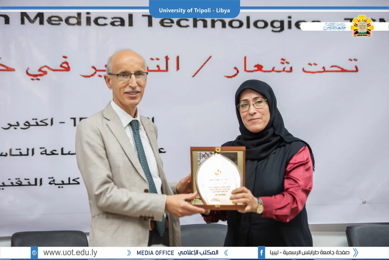 بتنظيم من كلية التقنية الطبية بجامعة طرابلس أقيم صباح اليوم السبت الموافق 15 أكتوبر 2022م على تمام الساعة التاسعة صباحاً مؤتمر طرابلس الأول للتقنيات الطبية بكلية التقنية تحت شعار: "التطوير في خدمات التقنية الطبية" بحضور السيد أ.د. خالد عون رئيس جامعة طرابلس رفقة السيد أ.د. صلاح الباروني وكيل الجامعة للكليات الطبية والسيدة أ.د. عائشة أحمد الشارف عميد كلية التقنية الطبية والسيد أ. محمود المصراتي، حيث شملت فعاليات المؤتمر محاضرات علمية لدكاترة الكلية ومناقشة مشاركات علمية من الطلبة. وفي الختام تم تكريم الأساتذة الذين قدمو الاستفادة العامة من خلال مشاركتهم في المؤتمر. كل الشكر والتقديم للقائمين على إنجاح المؤتمر بالمستوى المنشود.