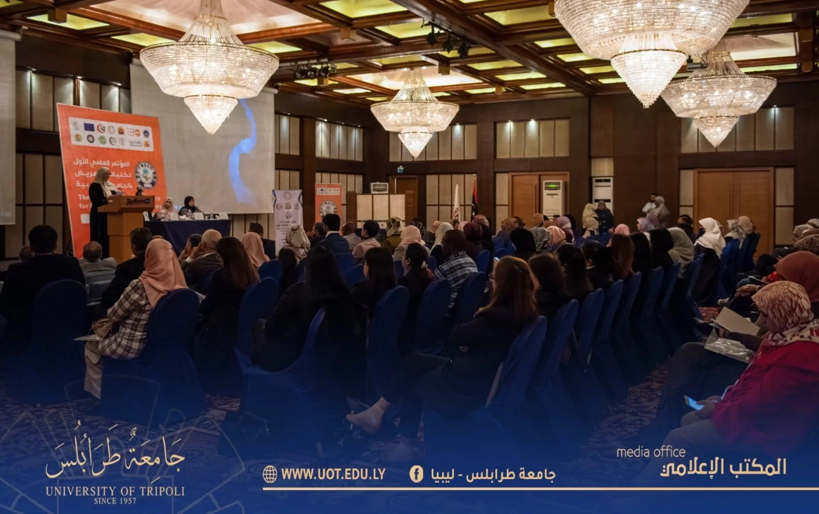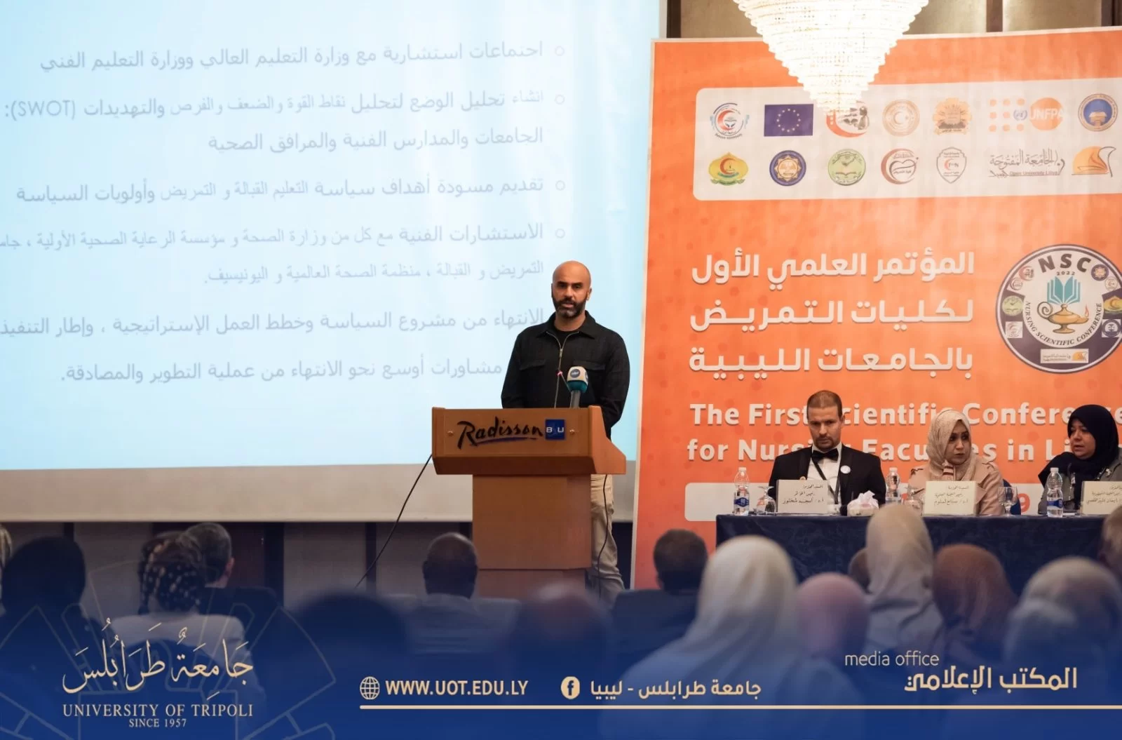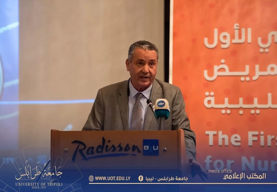أُفتتح صباح اليوم السبت الموافق 19 نوڤمبر 2022م بفندق المهاري على تمام الساعة العاشرة صباحاً المؤتمر العلمي الأول لكليات التمريض بالجامعات الليبية وذلك بتنظيم كلية التمريض - جامعة طرابلس بحضور السيد د. خالد غومة رئيس جامعة طرابلس المكلف رفقة السيد أ.د. أمجد شختور وكيل الجامعة للكليات الطبية وعميد كلية التمريض والسيد وكيل الجامعة للقاطع ج و عدد من السادة عمداء الكليات الطبية بالجامعة وممثل عن لجنة الصحة بمجلس النواب وممثلي وزارتي الصحة والتعليم العالي والبحث العلمي بالإضافة إلى الجهات الداعمة والمشاركة بالمؤتمر ومسؤولي كليات التمريض بالجامعات الليبية والمهتمين بالمجال.حيث استهل البرنامج الزمني للمؤتمر بآيات بينات من الذكر الحكيم تليها النشيد الوطني، انتقالاً إلى عرض مرئي شامل عن كليات التمريض بالجامعات الليبية، ومن ثم تم الابتداء ببرتوكول الكلمات حسب التسلسل السليم المتعارف عليه ابتداءً من كلمة رئيس المؤتمر واللجنة التحضيرية له، مروراً بكلمة رئيس اللجنة العلمية وكلمة رئيس جامعة طرابلس المكلف وكلمات المؤسسات المعنية والمُشاركة منها (وزارة التعليم العالي والبحث العلمي ووزارة الصحة ولجنة الصحة بمجلس النواب واللجنة العليا للكليات الطبية والطبية المساعدة وأيضاً صندوق الأمم المتحدة للسكان/ ليبيا ومدير مكتب الدراسات العُليا بكلية التمريض - جامعة طرابلس ومصحتي الخليل والمسرة وأخيراً كلمة اتحاد الطلبة.وبعد الفصل باستراحة زمنية بسيطة تم الانطلاق بالمسيرة العلمية والعملية للمؤتمر، حيث قُص شريط الافتتاح الافتراضي للجلسة الحوارية الأولى ليوم السبت التي شملت في طياتها خمسة محاضرات علمية غطت كافة المحاور المهمة لمجال التمريض ودارسيه، حيث أن المحاضرة الأولى كانت مُسلطة الضوء على جودة التمريض في كليات التمريض بليبيا ومن ثم سلطت الضوء على أخلاق المهنة وسلامة المريض وكذلك ضمان جودة مخرجات البرامج التعليمية لكليات التمريض وأيضاً المعايير المهنية للممارسة والسلوك للممرضات والقابلات وأخيراً التحديات التي تواجه المريض في ليبيا.