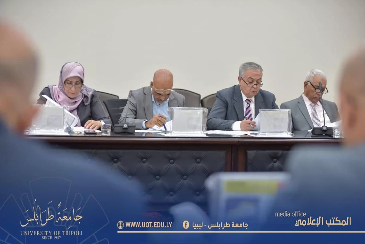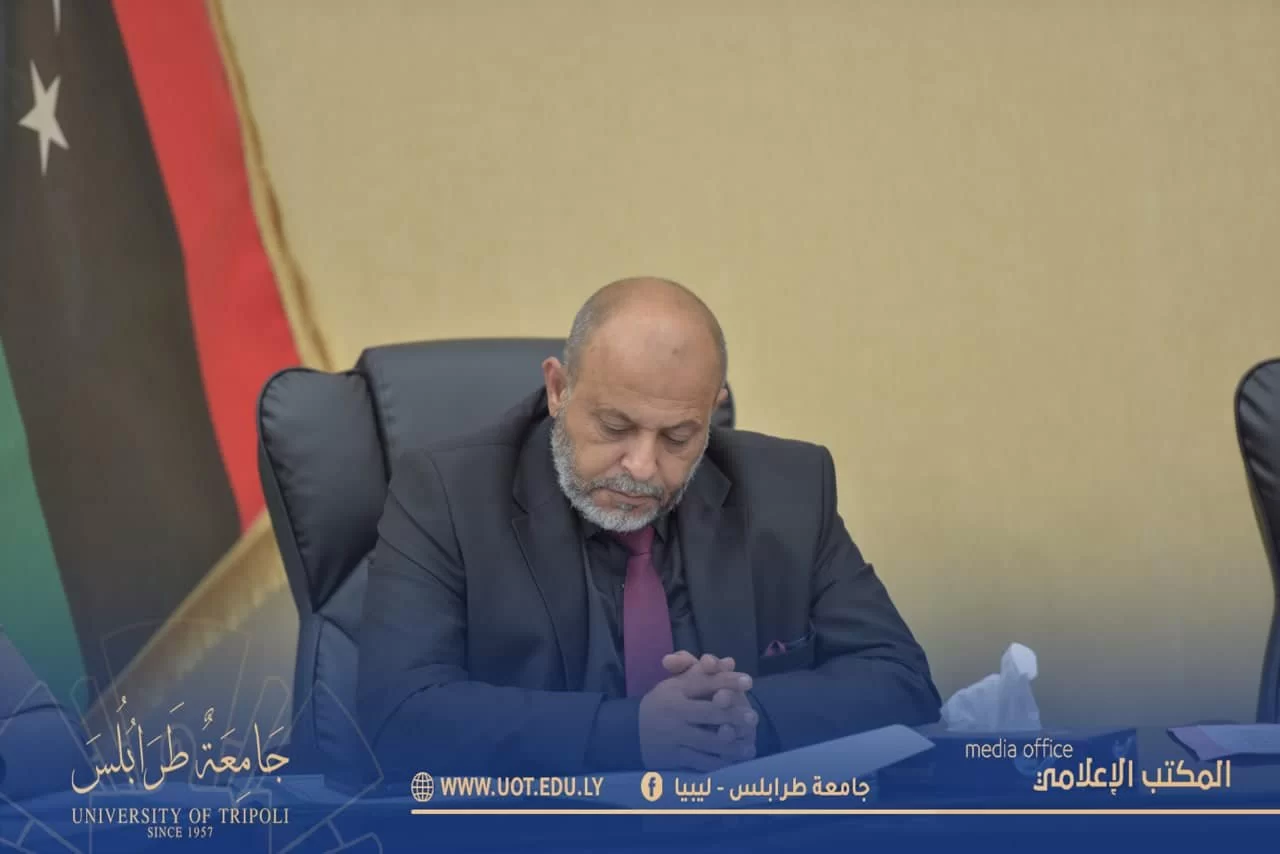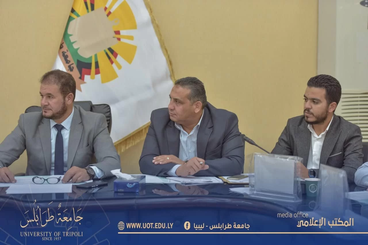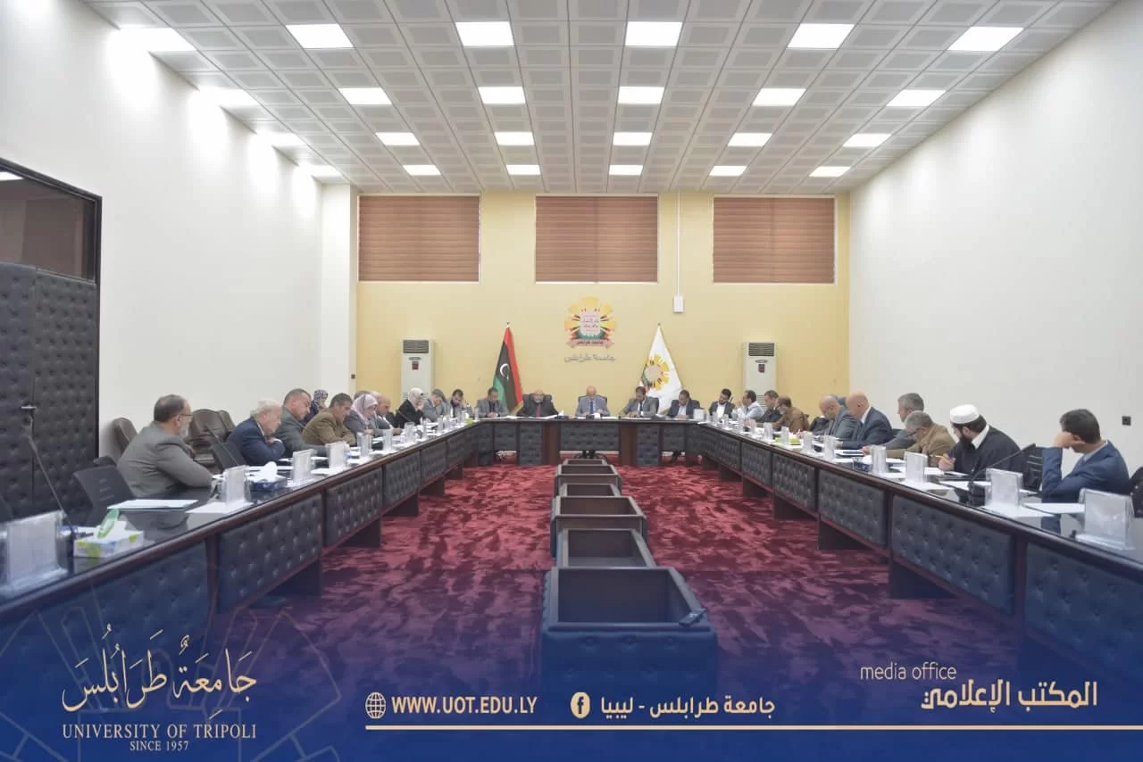 أقيم صباح اليوم الاثنين الموافق 21 نوفمبر 2022م بصالة اجتماعات رئاسة الجامعة الاجتماع الحادي عشر العادي للعام 2022م، بحضور السيد أ.د. خالد عون رئيس جامعة طرابلس والسادة الوكلاء وعمداء الكليات بالجامعة رفقة السادة رؤساء النقابات بالجامعة والسيد المسجل العام بالجامعة. حيث نوقشت عدة ملفات هامة أبرزها مناقشة طلب المركز الليبي الدولي للتدريب لإحتياجات الخريجين لتأهيلهم لسوق العمل، تشكيل لجان داخل الكليات للعمل على متطلبات ترقية الموقع الإلكتروني للجامعة، بالإضافة إلى عرض ومناقشة عدة مراسلات أبرزها ( الطلبة المجهرين، دمج بعض من المقررات الدراسية بكلية الصيدلة، اعتماد الاسم الصحيح لقسم التجارة الإلكترونية بكلية الاقتصاد والعلوم السياسية، عرض كلية التريبة طرابلس بشأن إقامة مؤتمر قسم اللغة الإنجليزية بالإضافة إلى عدد من مراسلات الوزارة). كما تطرق المجلس في بند الاتفاقيات إلى اعتماد اتفاقيات التعاون العلمي مع عدد من الجامعات الاندونيسية. بالإضافة إلى اعتماد عدد من محاضر الاجتماعات للمجالس العلمية بالكليات، ختاماً تعديل البرنامج الدراسي 2022م / 2023م.