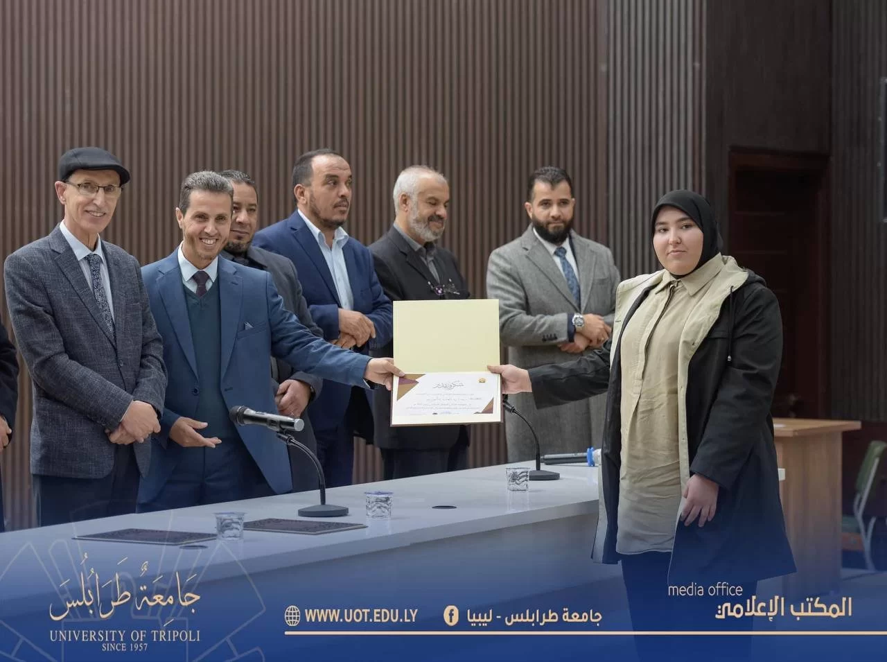 أُقيمت صباح اليوم الأحد الموافق 8 يناير 2023 م احتفالية تكريم الطلبة المتفوقين بكليات القاطع " ج " للفصل الدراسي " ربيع 2022 م " وعرض مشروع إعادة تأهيل مخطط عام المركب " ج " تاجوراء وذلك على تمام الساعة 11:00 صباحاً بمدرج رشيد كعبار بحضور السيد رئيس جامعة طرابلس رفقة السيد وكيل وزارة الزراعة والسيد وكيل الجامعة للشؤون العلمية والسيد وكيل الجامعة للقاطع " ج " والسيد وكيل الجامعة للشؤون الطلابية والسيد وكيل العلوم الطبية والسيد المسجل العام والسيد عميد كلية الاقتصاد والعلوم السياسية والسيد عميد كلية تقنية المعلومات والسيد وكيل كلية تقنية المعلومات والسيد منسق كلية القانون تاجوراء والسادة أعضاء المجلس البلدي تاجوراء ولفيف من أعضاء هيئة التدريس والطلبة وذويهم، حيث تم تكريمهم وتسليم شهائد تفوقهم من رئاسة الجامعة إضافةً لبعض الجوائز التحفيزية وذلك من منطلق دعم جامعة طرابلس الدائم لأبنائها المتميزين والدفع بهم للمضي قدماً نحو الأمام والتفوق .