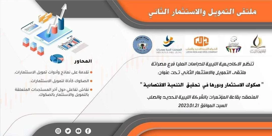 شاركت صباح اليوم السبت الموافق 21 يناير 2023 م كلية الاقتصاد والعلوم السياسية بجامعة طرابلس بملتقى التمويل والاستثمار الثاني تحت عنوان: "صكوك الاستثمار ودورها في تحقيق التنمية الاقتصادية" المُقام بتنظيم الأكاديمية الليبية للدراسات العُليا فرع مصراتة، هذا وقد شاركت الكلية بالملتقى ممثلة لجامعة طرابلس، حيث ركز الملتقى على محاور مهمة ذات صلة بالموضوع حيث استهلت برامج الملتقى بتقدمة على نماذج وأدوات تمويل الاستثمارات مروراً بالصكوك كأداة لتمويل الاستثمارات وختاماً بنقاش تفاعلي حول أخر المستجدات المتعلقة بالتمويل والاستثمار بالصكوك.