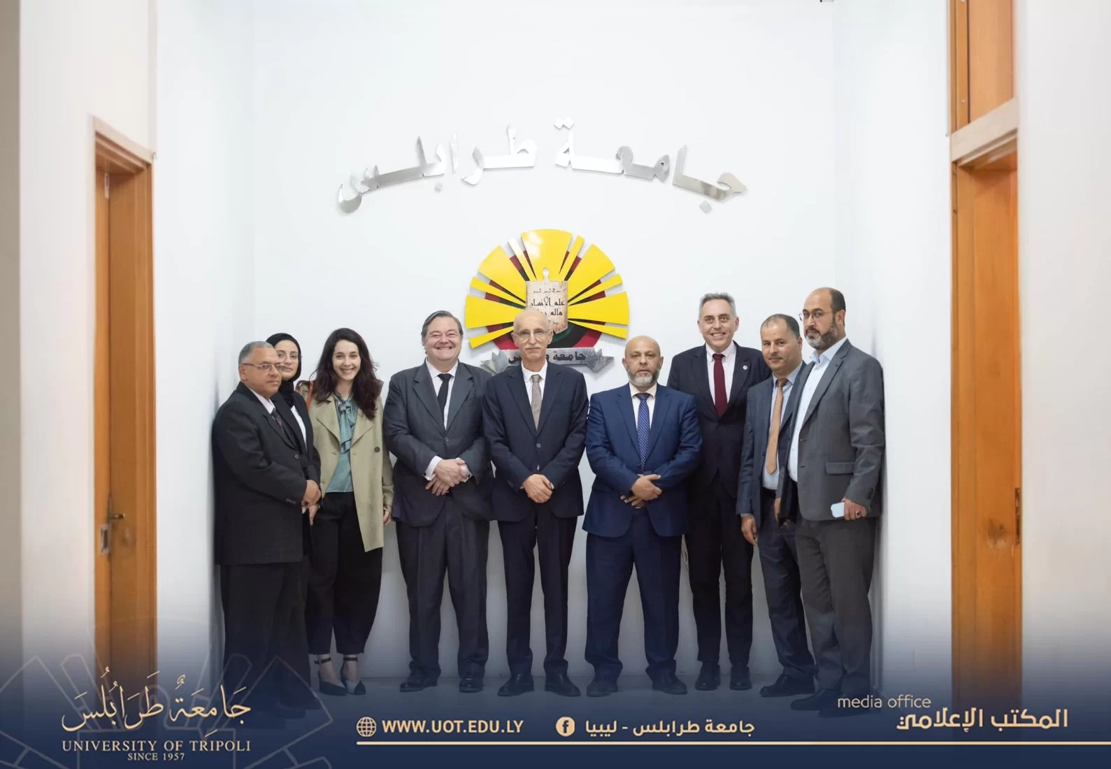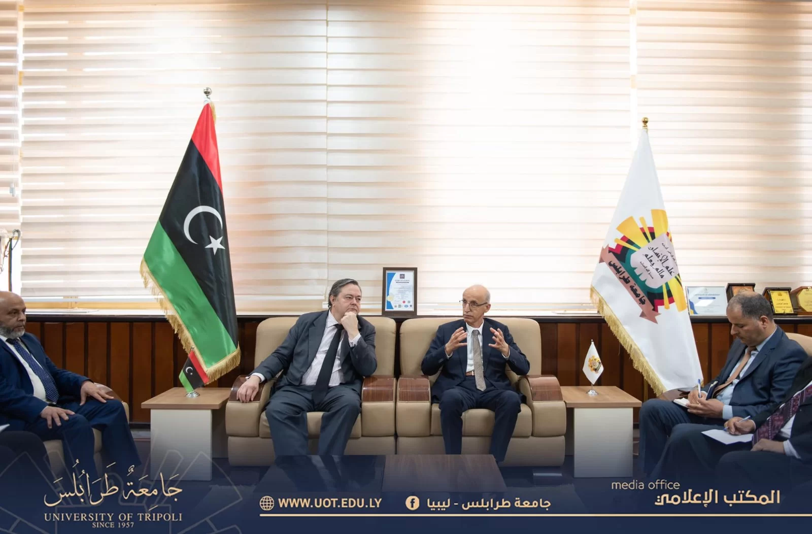 سفير إسبانيا السيد خافيير اولالكياغيا يزور رئاسة جامعة طرابلس رفقة السيد خرمينال فراسيا مدير معهد ثيربانتس بتونس والسيدة قنصل إسبانيا بليبيا، وقد حضر اللقاء عميد كلية اللغات ورئيس قسم اللغة الإسبانية بجامعة طرابلس والملحق الثقافي الليبي بالسفارة الليبية بمدريد، وقد تناول اللقاء أوجه التعاون المختلفة بين الجامعات الإسبانية وجامعة طرابلس، إضافة إلى إمكانية فتح فرع لمعهد ثيربانتس بجامعة طرابلس، وتنفيذ برنامج لتدريب أعضاء هيئة التدريس وامتحان طلاب اللغة الإسبانية في ليبيا في شهادات الكفاءة التي يصدرها المعهد، وقد تم الاتفاق على تكثيف الاتصال بين الطرفين للوصول إلى اتفاقية وبرنامج تعاون مثمر.