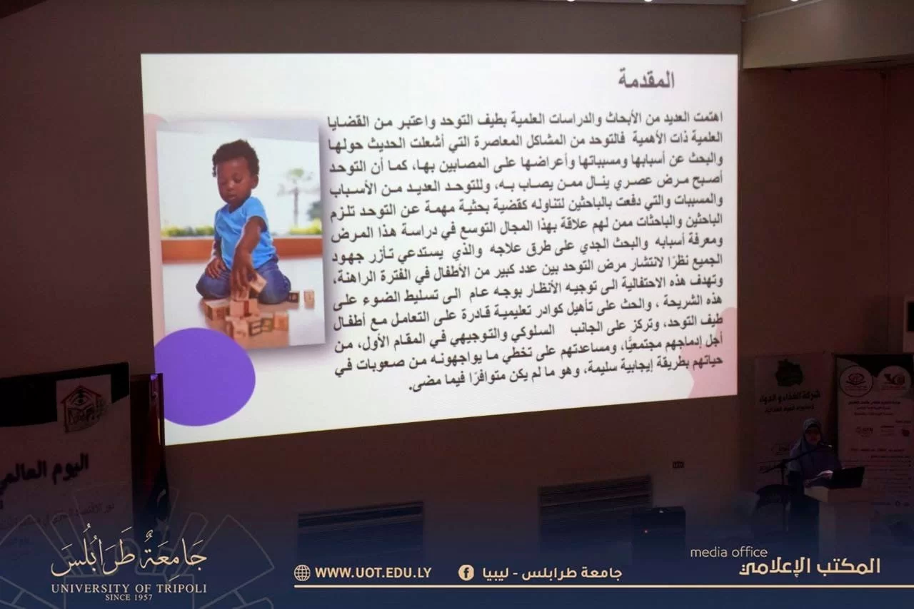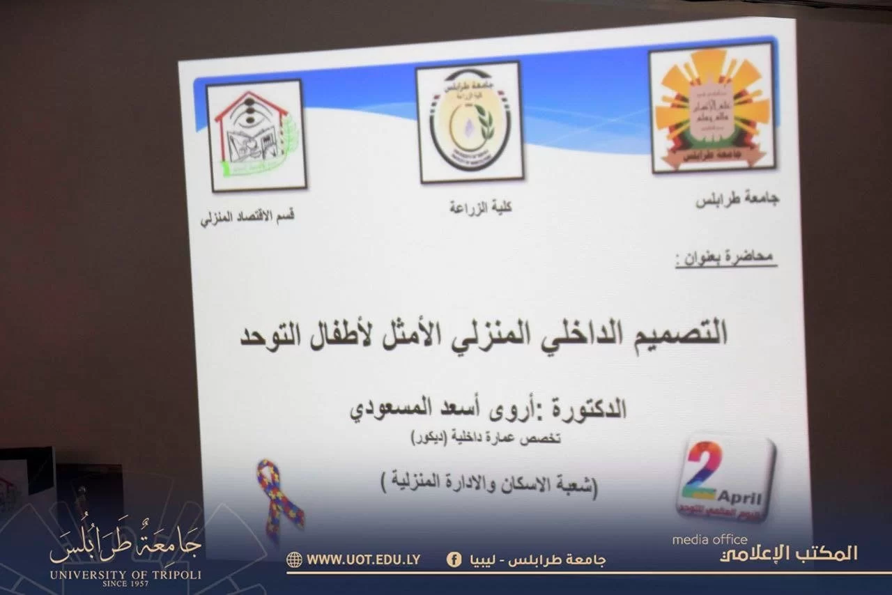 أقيمت صباح يوم الخميس الموافق 4 مايو 2023 م بكلية الزراعة - جامعة طرابلس احتفالية قسم الاقتصاد المنزلي باليوم العالمي للتوحد بحضور كلاً من السيد رئيس جامعة طرابلس والسيدة عميد كلية الزراعة ولفيف من موظفي وأعضاء هيئة تدريس بالجامعة والسادة الحضور .حيث تخللت الاحتفالية العديد من المحاضرات العلمية والمناشط الثقافية.