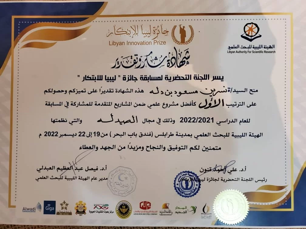 حازت كلية الصيدلة /جامعة طرابلس علي الترتيبين الأول والثالث في مسابقة (جائزة ليبيا للإبتكار) لأفضل مشروع تخرج لخريجي المرحلة الجامعية والإجازة العالية ومايعادلهاوالتي تشرف عليها الهيئة الليبية للبحث والعلوم والتكنولوجيا