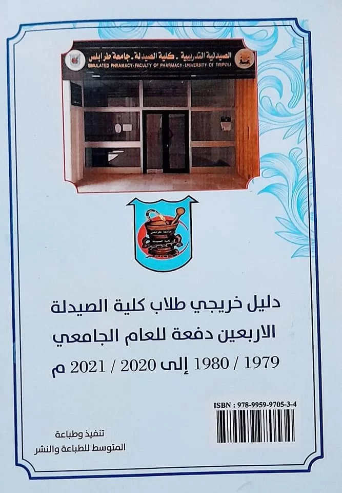 تم بحمد الله وتوفيقه الإنتهاء من طباعة دليل خريجي كلية الصيدلة (جامعة طرابلس)متضمنا الدفعات الأربعين التي خرجتها الكلية منذ العام 1979-1980 وحتى العام الجامعي 2020-2021ويشمل الدليل على عدد 4811 خريج وخريجة