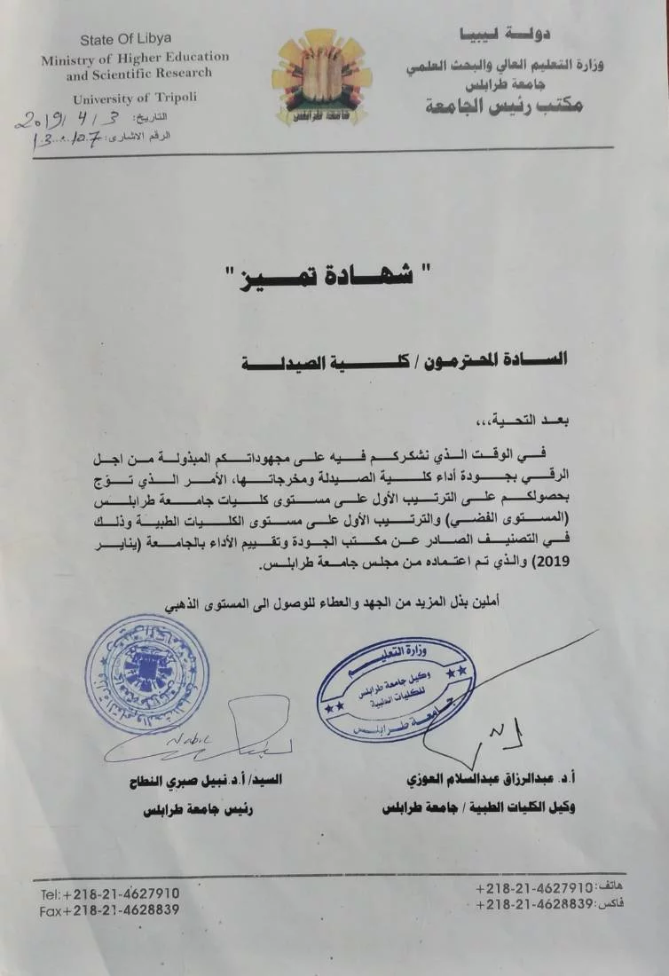 تحصلت كلية الصيدلة علي شهادة تميز لحصولها علي الترتيب الأول علي مستوى كليات جامعة طرابلس (المستوى الفضي) والترتيب الأول علي مستوى الكليات الطبية وذلك في التصنيف الصادر عن مكتب الجودة وتقييم الأداء بالجامعة (يناير 2019)والذي تم اعتماده من مجلس جامعة طرابلس