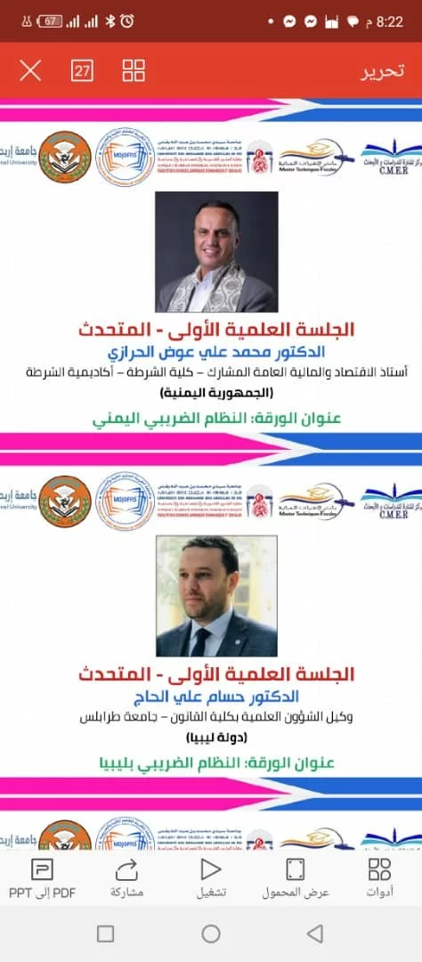نظم مركز المنارة للدراسات والابحاث وبشراكة مع ماستر التقنيات الجبائية بكلية العلوم القانونية والاقتصادية والاجتماعية باكادير وبالتعاون مع المجلة المغربية للعلوم المالية والضريبية وبحضور جامعة إربد الاهليةبالاردن ندوة عن بعد حول موضوع اصلاح النظم الضريبية العربية بتاريخ 23 ابريل2023. بمشاركة نخبة من