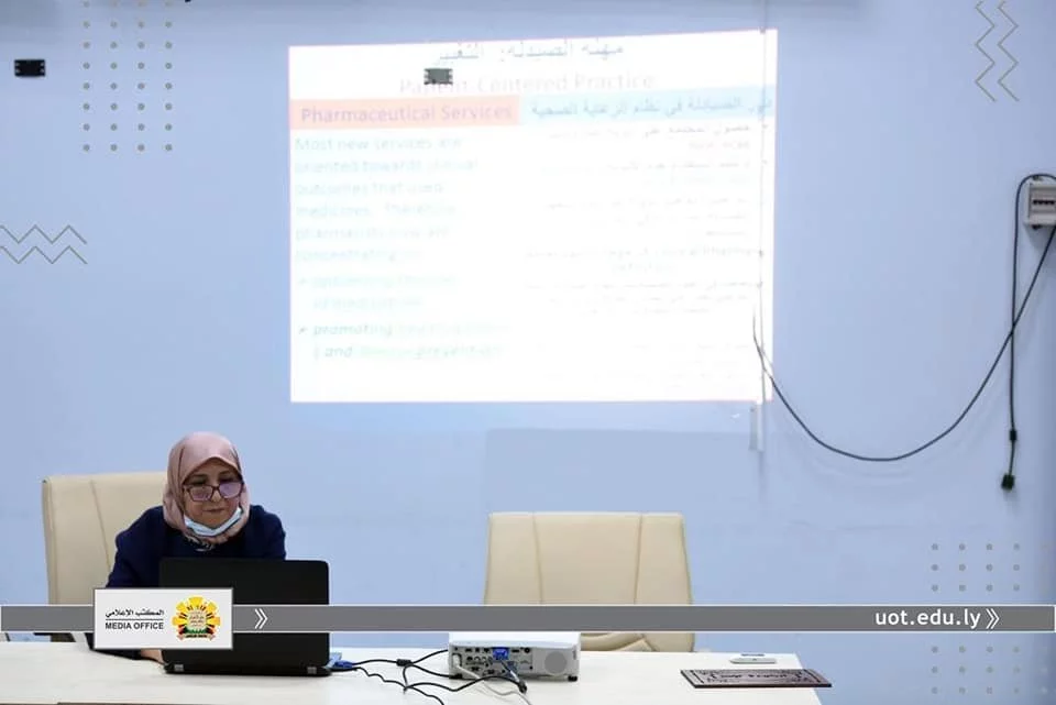 قام مركز البحوث والإستشارات والتدريب صباح يوم الثلاثاء الموافق 22/12/2020 بتنفيذ محاضرة علمية بمدرج مالك بن نبي بخصوص الخدمات الصيدلانية في زمن أزمة COVID-19حيث قام بتقديم المحاضرة "أ.د. آمال يوسف بن كوره" عضو هيئة التدريس بكلية الصيدلة، وشارك بالمحاضرة عدد من أعضاء هيئة التدريس والمهتمين، كما شارك عدد آخر عن طريق المنصة الإلكترونية Microsoft Teams.بعد انتهاء المحاضرة تم فتح المجال أمام المشاركين لتقديم ملاحظاتهم مقدمة المحاضرة والتى قامت بالرد عليها.ومن هذا المنبر تتقدم إدارة مركز البحوث والاستشارات والتدريب بخالص الشكر إلى "آمال كوره" على المحاضرة القيمة ولكافة المشاركين على تفاعلهم مع موضوع المحاضرة.