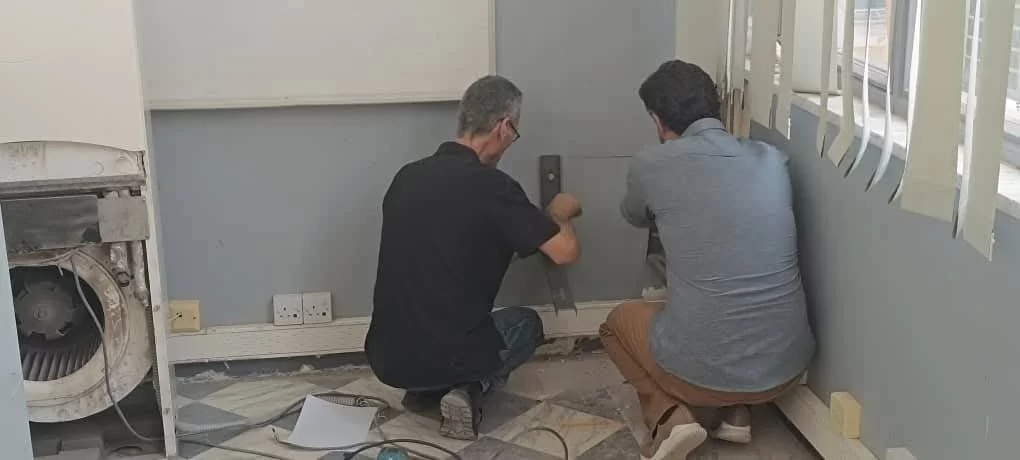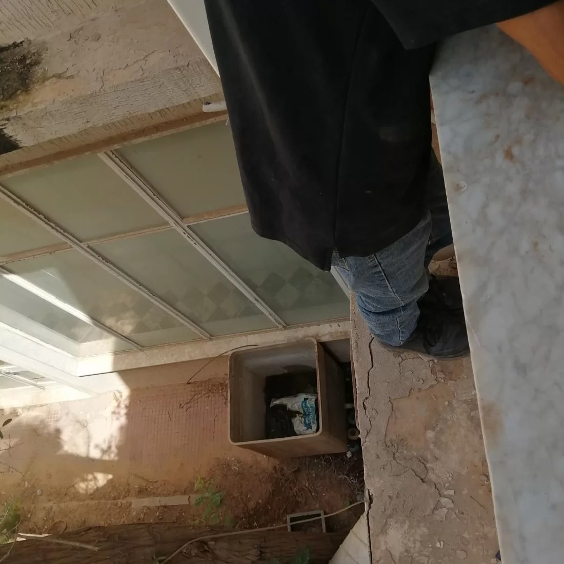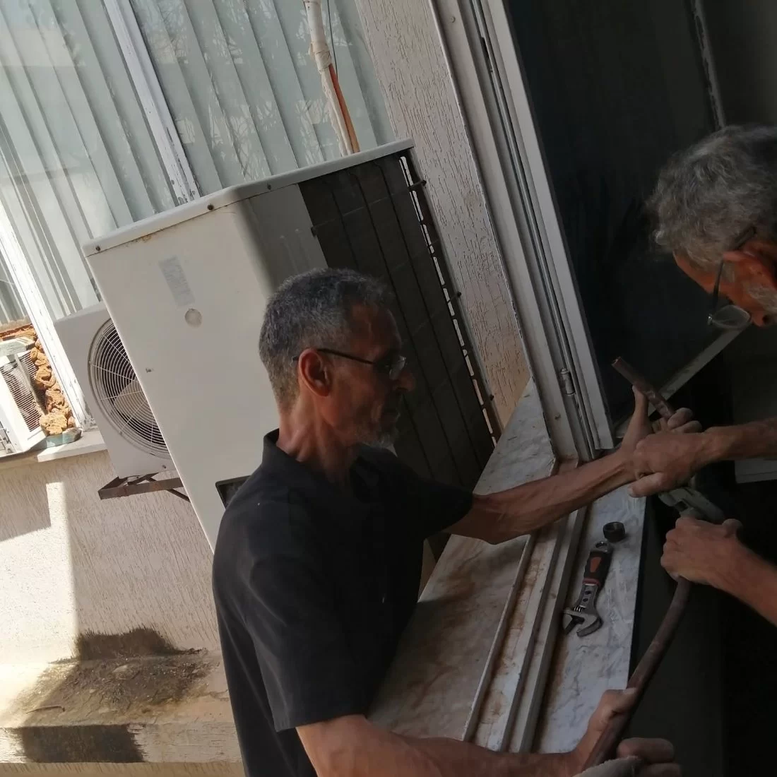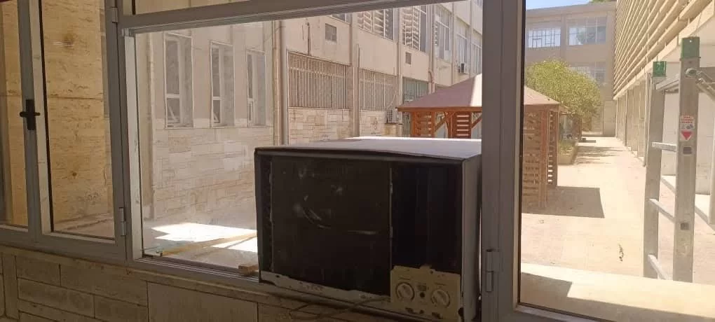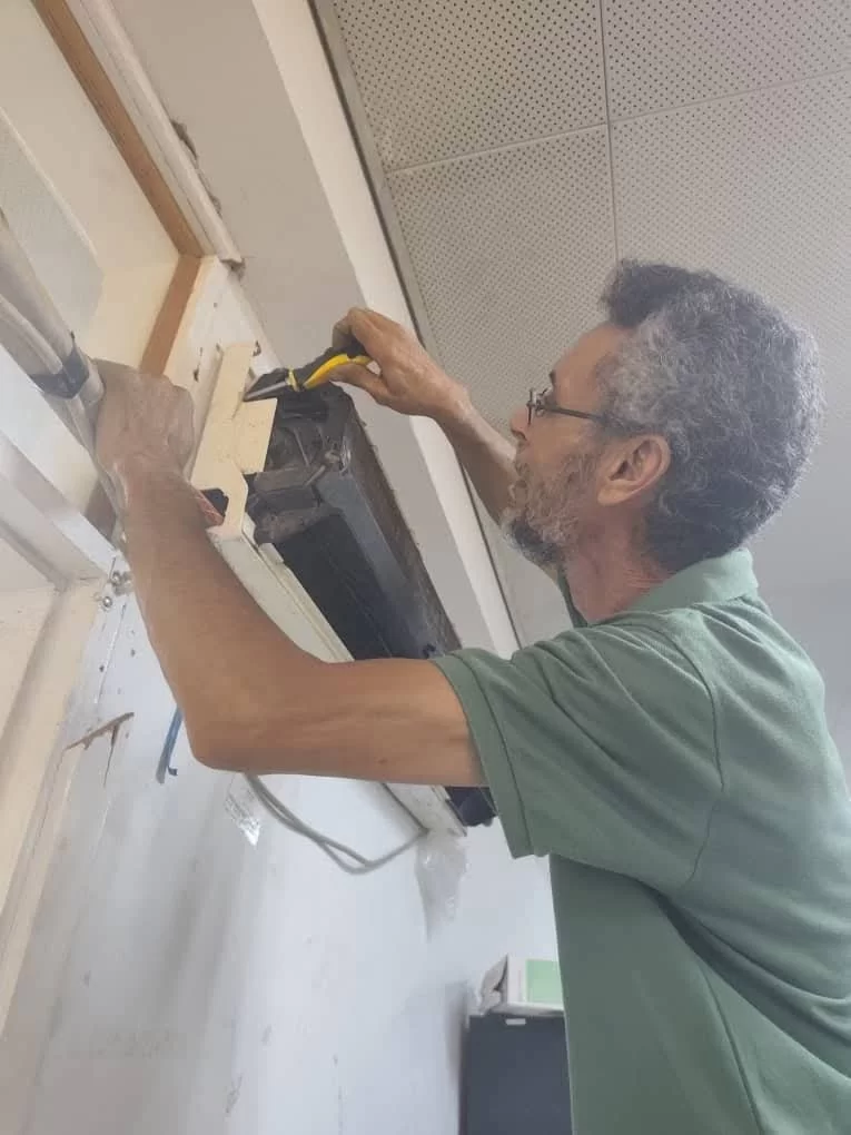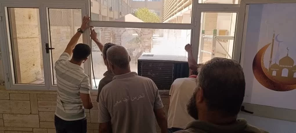 *أعمال صيانة وتركيب أجهزة التكييف في الطابق العلوي رغم خطورة التنفيد نظرا لعدم توفر المعدات اللازمة.