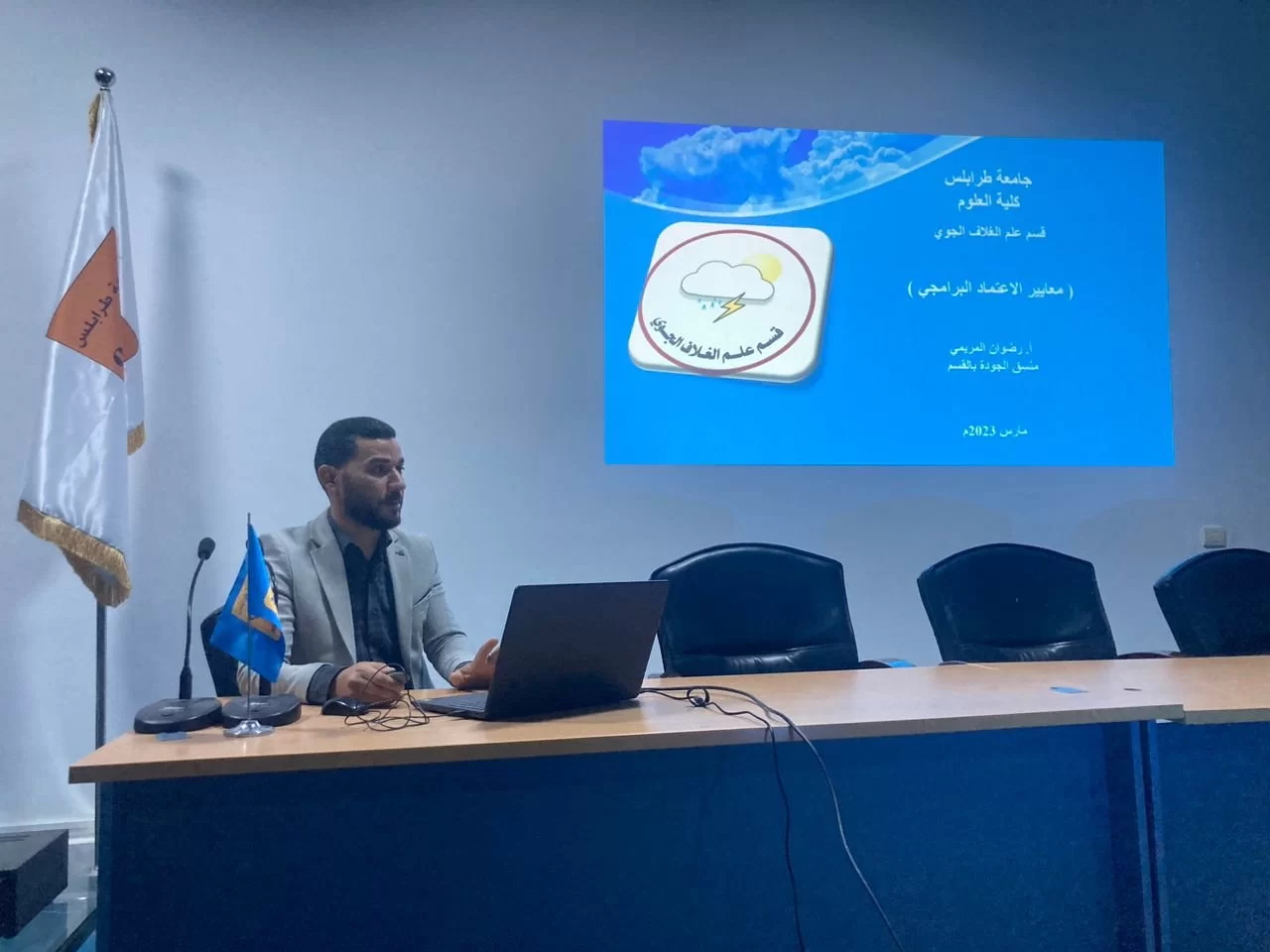 Under the supervision of the Quality and Performance Assessment Office of the College, a workshop on quality standards for the Department of Atmospheric Science programmatic accreditation was held on Thursday, 23 March 2023, at 12:00 hours. Rizwan Al-Marimi, Quality Coordinator in the Department of Atmospheric Science, addressed the indicators of program accreditation standards for quality assurance in the presence of some department quality coordinators.