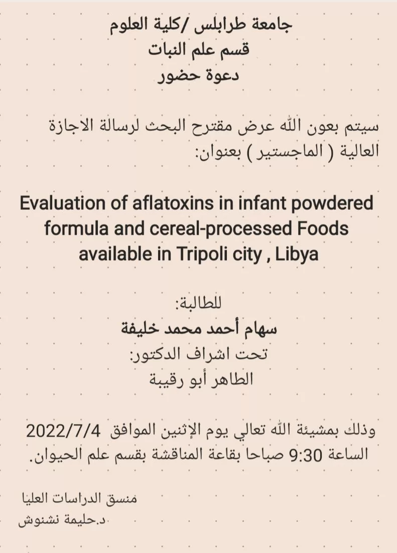 مناقشة مقترح رسالة الإجازة العالية ( الماجستير ) بعنوان : تقييم الأفلاتوكسينات في حليب الرضع المجفف والأغذية المصنعة من الحبوب المتوفرة في طرابلس، ليبيا