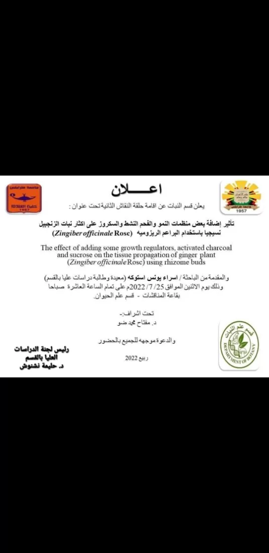 تم اليوم الاثنين2022/7/25 علي تمام الساعة 9.00صباحا بقاعة المناقشة في قسم علم الحيوان
