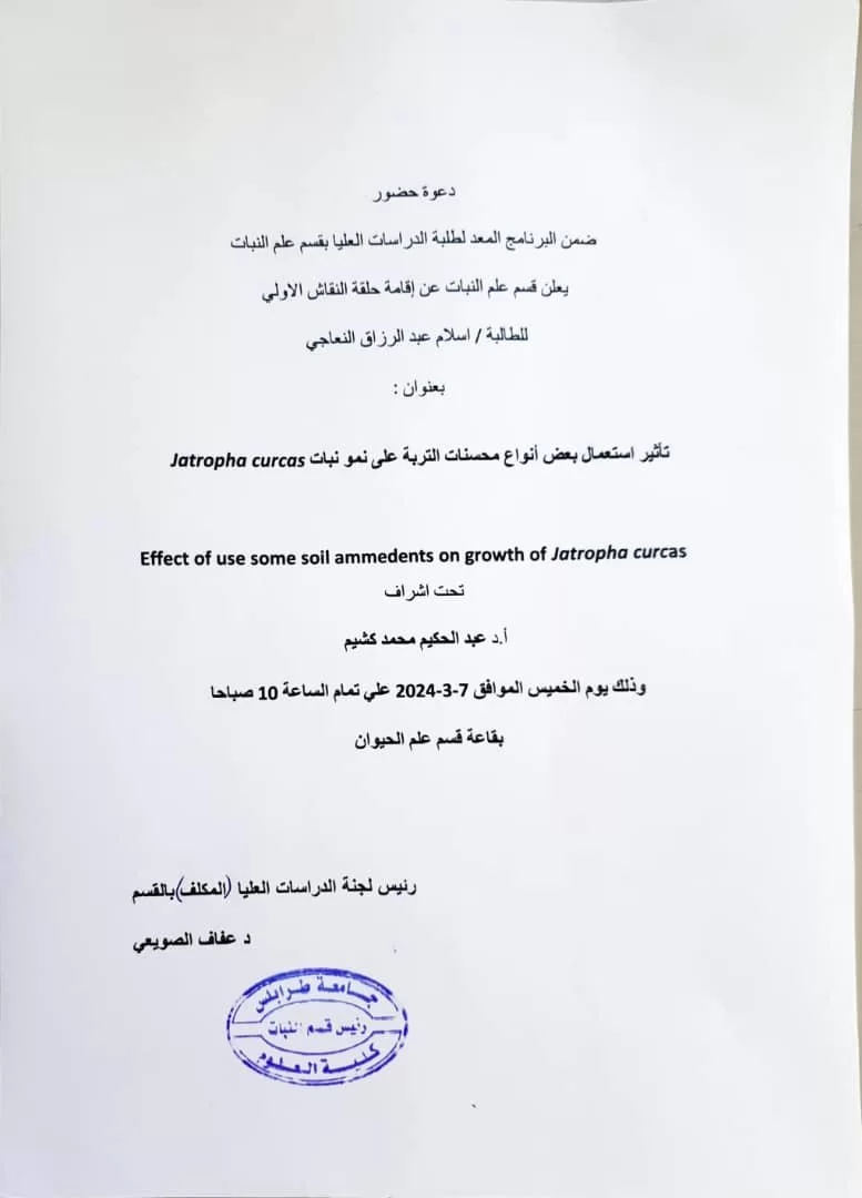 أُقيمت صباح اليوم الخميس الموافق 7 مارس 2024 م بقاعة قسم علم الحيوان حلقة النقاش الاولى (مقترح) الخاصه بمتطلبات الاجازة العالية ( الماجستير) بالقسم.