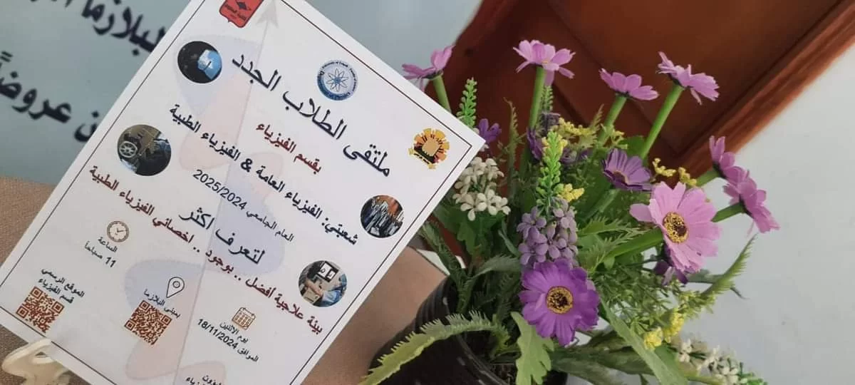 أقيم اليوم الاثنين الموافق 18/ 11 /2024م ملتقى الطلاب الجدد بقسم الفيزياء بكلية العلوم جامعة طرابلس تحت شعار بيئة علاجية أفضل .. بوجود .. اخصائي الفيزياء الطبية.افتتح اللقاء أ. د. عبدالله الكلش رئيس قسم الفيزياء مرحبا بالضيوف والاساتذة والطلاب والقى ا.د. يوسف امحمد مدير مكتب التعاون الدولي