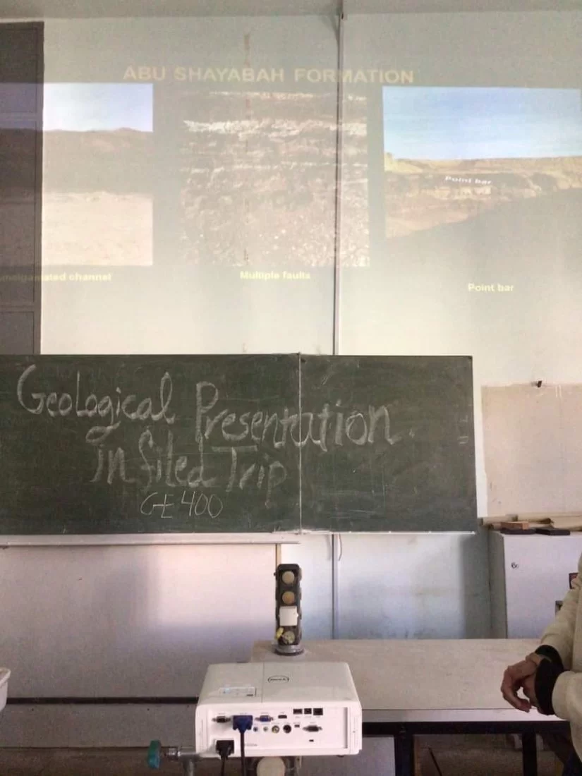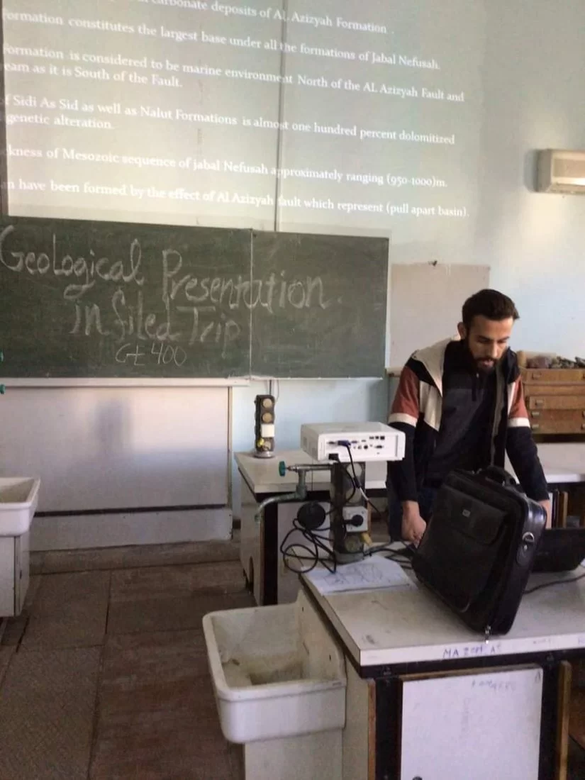واصل ولليوم الرابع على التوالي طلاب القسم المشاركون بمقرر الجيولوجيا الحقليه GE400 في استكمال عروض لتقاريرهم العلميه اليوم الاثنين الموافق 31/01/2022 م وكل طالب على حده ، نتائج العمل الحقلي الذي قاموا به خلال الرحله الحقليه والتي كانت خلال الفتره من 23/12/2021 م وحتى تاريخ 07/01/2022 م في منطقه جبل نفوسه والتي كانت تحت إشراف الساده :