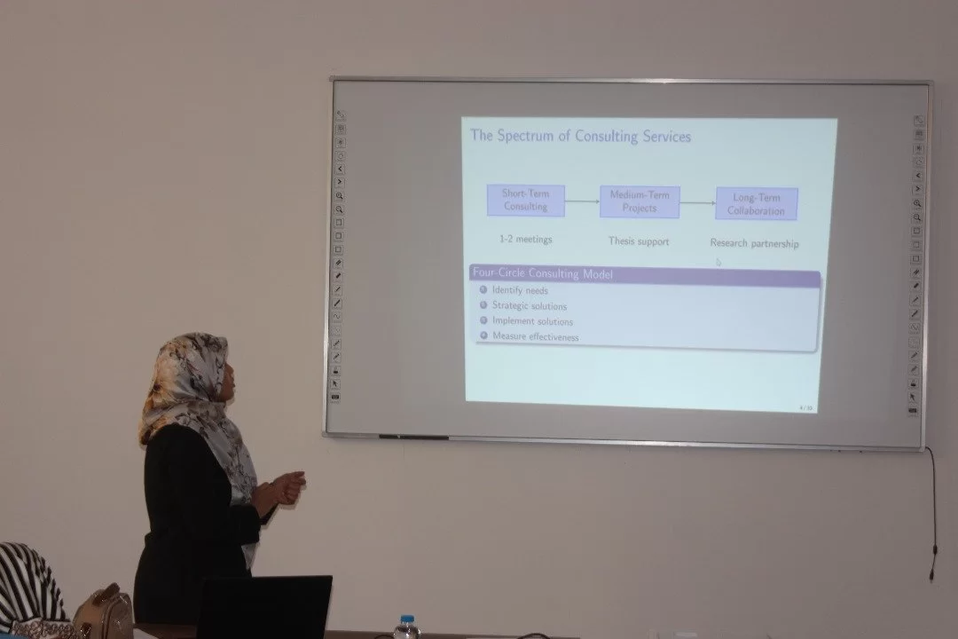 كما تضمن برنامج الورشة محاضرة علمية للدكتورة منى حمودة، استشاري احصائي وعضو هيئة التدريس بقسم الاحصاء التطبيقي بكلية الاقتصاد والعلوم السياسية بجامعة طرابلس، وكانت بعنوان: