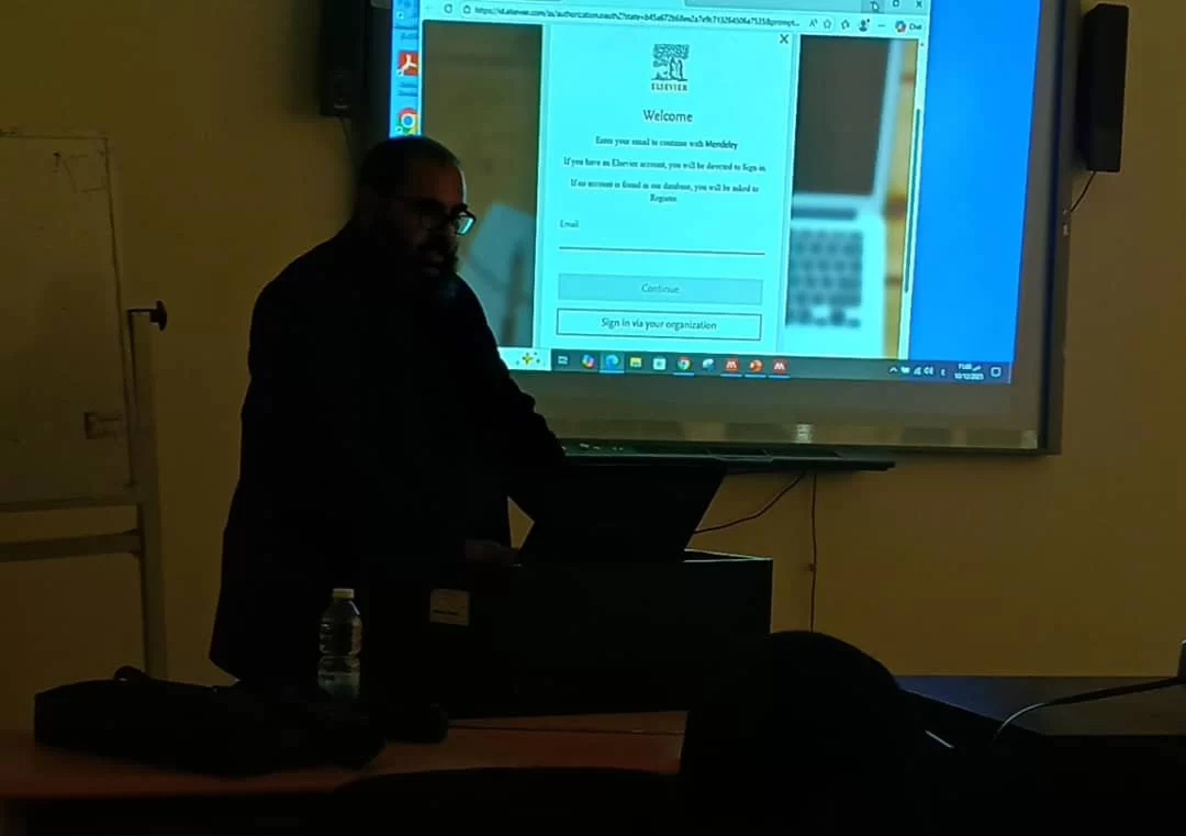افتتح الورشة أ. د. خالد المرغني مدير مكتب الدراسات العليا والتدريب بالكلية مرحباً بالمحاضرين والسادة والسيدات الحضور من طلاب الدراسات العليا والبحاث تم قدم طالب الدكتوراة م. إبراهيم الهادي الطويل المحاضرة الاولى عن استخدام برنامج Mendeley فى ترتيب وكتابة المراجع العلمية والتى تسهم فى المحافظة على الوقت في ترتيب وإدارة المراجع العلمية خلال المسيرة البحثية للطالب. كما قام طالب الدكتوراة م. محمد البرغوث بتقديم محاضرة علمية عن العرض الاكاديمي لما له من اهمية فى اعطاء صورة واضحة عن طبيعة البحث ونتائجه.