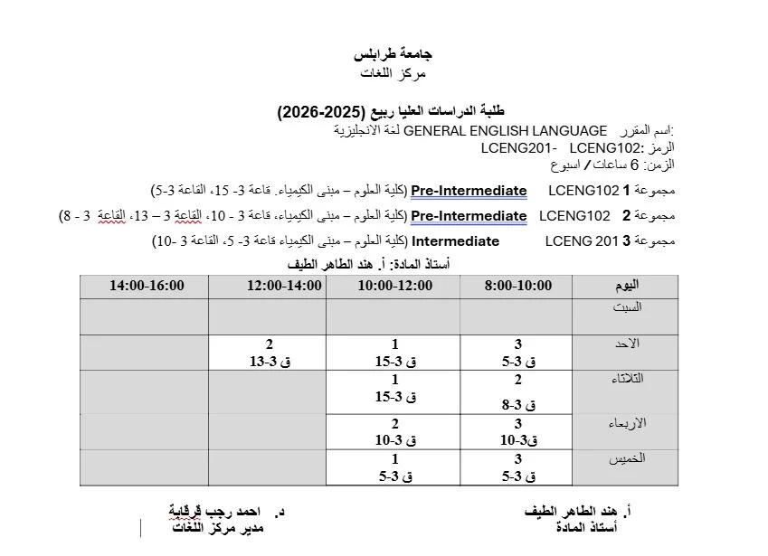 الجداول الدراسية لبرنامج اللغة بكلية العلوم لفصل الربيع 2026م