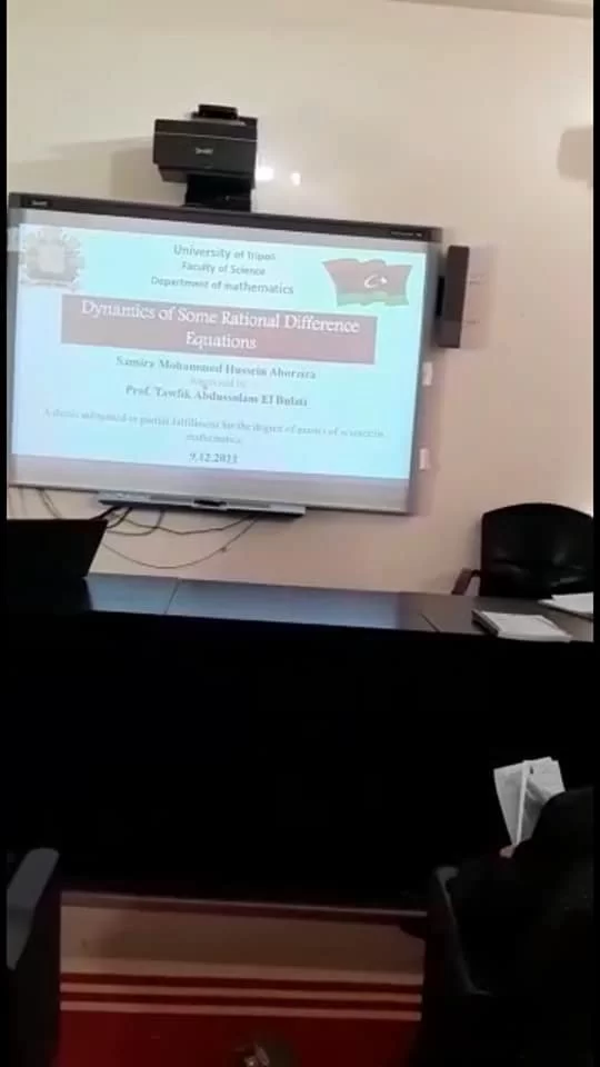 تمت مناقشة رسالة الماجستير يوم الخميس بتاريخ 9\12\2021 بقاعة الدراسات العليا، والمقدمة من طالبة الدراسات العليا بقسم الرياضيات سميرة محمد حسين أبورزيزة ، والتي بعنوان " Dynamics of Some Rational Difference Equations"وكانت لجنة المناقشة كالتالي:1) أ.د. توفيق عبد السلام البولاطي/ الأستاذ المشرف2) أ.د. محمد فرج الجزيري/ ممتحن داخلي 3) د.علي سالم عون/ ممتحن خارجي - جامعة الزاويةيتزايد تطبيق نظرية معادلات الفروق بسرعة في مختلف المجالات، مثل نظرية التحكم، و الرياضيات المحدودة، و علوم الكمبيوتر. الأهم من ذلك، يتم استخدامها في دراسة طرق تقدير المعادلات التفاضلية، و أحد أبرز و أهم تطبيقاتها استخدامها في التشفير و الترميز.الهدف من هذا البحث هو دراسة بعض ديناميات معادلات الفروق القياسية.تعتبر دراسة معادلات الفروق القياسية ذات الرتب العليا طموحة و جديرة بالاهتمام لأن بعض النماذج لتطوير النظرية الأساسية للسلوك الكلي لمعادلات الفروق ذات الرتب العليا تأتي من نتائج معادلات الفروق القياسية. لذلك، فإن دراسة معادلات الفروق القياسية ذات الرتب العليا تستحق مزيداً من الدراسة.حيث تم التركيز علي دراسة اثنين من ديناميات معادلات الفروق القياسية و أول ما درس في البحث هو ديناميات و سلوك معادلة الفروق القياسية من الرتبة الثانية بحيث تم اعطاء وصفاً للحلول الدورية من الدورة الثانية و الثالثة و نقاط الاتزان و التقارب الكلي و الحدودية من الحل للمعادلة.و أخيراً تم دراسة الاستقرار المقارب الكلي لمعادلة فروق قياسية من رتب عليا، بحيث تم التركيز على الحلول الدورية بدورتين و نقاط الاتزان و الاستقرار المحلي و الكلي لجميع الحلول غير السالبة لهذه المعادلة.في نهاية المناقشة أجيزت الرسالة بدون ملاحظات.تتقدم لجنة المناقشة وقسم الرياضيات بأحر التهاني للطالبة لحصولها على درجة الماجستير متمنين لها التقدم في حياتها المهنية.