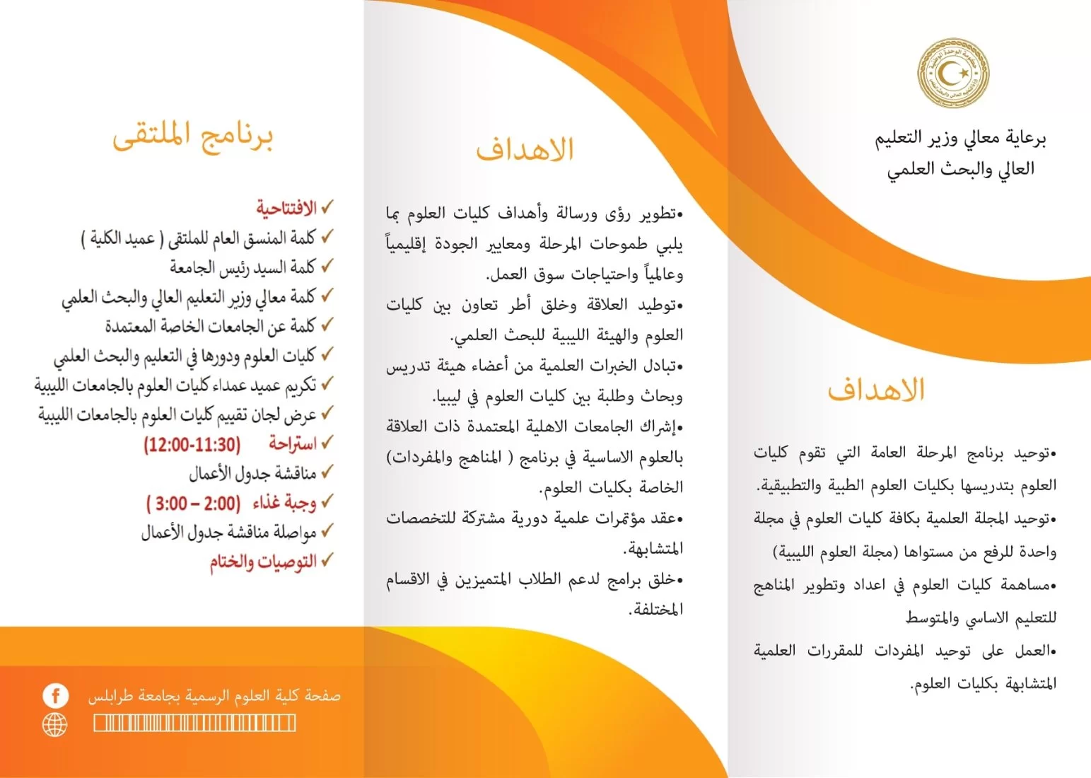 تعتزم كلية العلوم جامعة طرابلس هذه الايام على الاعداد للملتقى الاول لعمداء كليات العلوم بالجامعات الليبية الذي يعقد إن شاء الله يوم السبت القادم الموافق 06/11/2021م تحت شعار "كليات العلوم بين الواقع والتحديات"، برعاية معالي السيد وزير التعليم العالي والبحث العلمي.تأمل كلية العلوم من الاساتذة المتخصصين في أي من محاور الملتقى أن يشارك بما لديه من افكار او ملاحظات مشكوراً عبر البريد الألكتروني لمكتب المعلومات والتوثيق بكليةالعلوم ،التالي:info.sci.ictc@uot.edu.lyتنتهز كلية العلوم جامعة طرابلس هذه الفرصة لتعرب للسادة عمداء كليات العلوم بالجامعات الليبية عن صادق تهانيها متمنية لهم نتائج إيجابية تخدم التعليم والتعلم لهذا الوطن الحبيب.