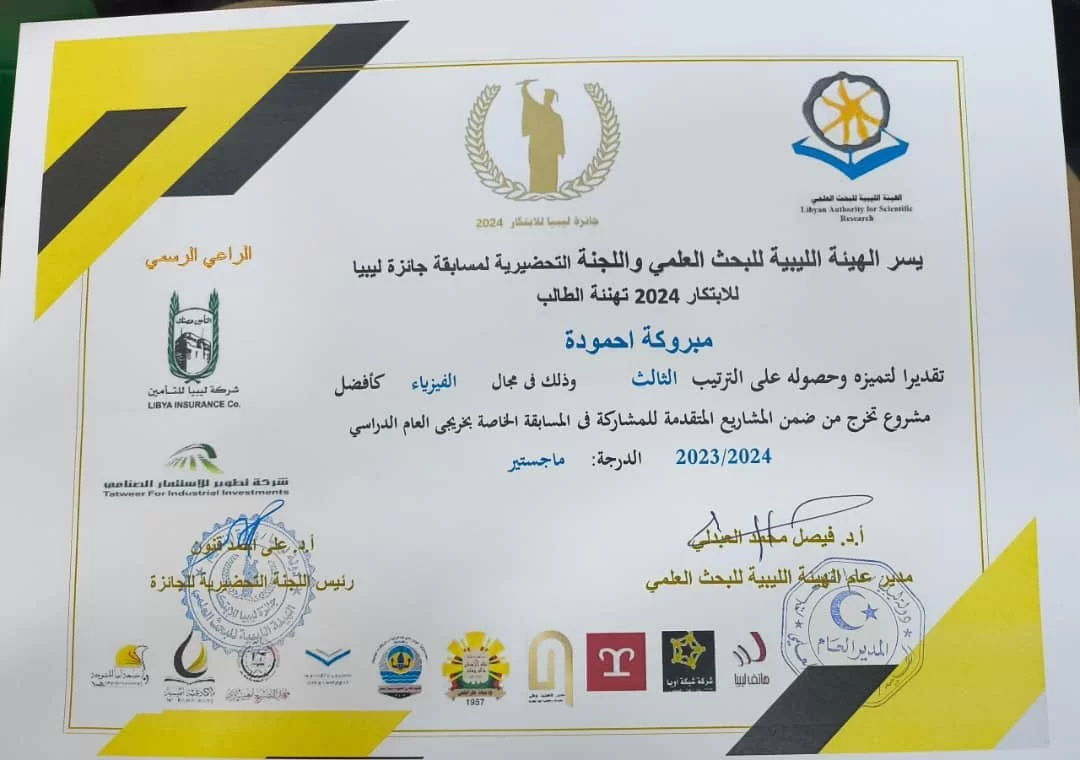 الهيئة الليبية للبحث العلمي واللجنة التحضيرية لمسابقة جائزة ليبيا للابتكار 2024 تمنح الطالبة نوال سويسي الترتيب الأول والطالبة مبروكة احمودة الترتيب الثالث في مجال الفيزياء كأفضل مشروع تخرج لدرجة الماجستير لخريجي العام الدراسي 2023-2024 ، وبهذه المناسبة يتقدم فسم الفيزياء بالتهنئة للدكتورة فوزية المبروك خميس بمناسبة تفوق طالبنيها