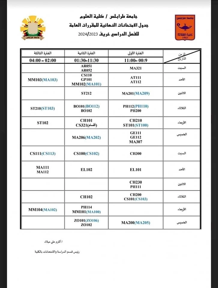 البرنامج الزمنـي وجدول الإمتحانات النصفية والنهائية لفصل الخريف 2023م