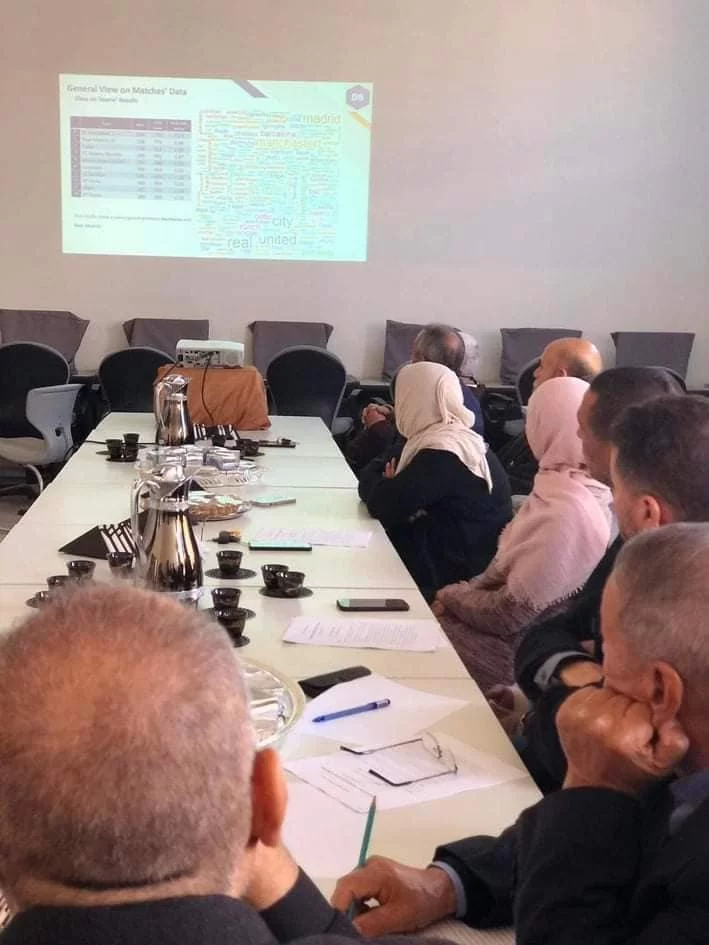 على تمام الساعة الحادية عشر صباحا في يوم الإثنين الموافق 6/12/2021 بمعمل (1) بقسم الإحصاء، تم تقديم العرض الثاني لرسالة الماجستير للمعيدة بالقسمالطالبة سهى امحمد علي الهدار. بإشراف د. عبداللطيف الصغير الطبال. والمعنونة: Data science: Statistical Analysis of Big Dataوبحضور عدد من أعضاء هيئة التدريس والطلبة في القسم، وكذلك بحضور كل من:السيد هشام مفتاح العباني.. رئيس مجلس الإدارة لشركة الإتحاد العربي للتأمين. والسيد الطاهر عبد السلام الزيتوني.. إدارة التخطيط الاستراتيجي لشركة ميليتا للغاز، حيث استعرضت خلاله الطالبة تطبيق خطوات علم البيانات على قاعدة بيانات الدوريات الاوروبية لكرة القدم للسنوات 2008/ 2016..وبعد العرض والنقاش المتبادل بين الحاضرين والأستاذة سهى، أشاد السادة الحضور بحسن اختيار الموضوع، وأهمية تطبيق علم البيانات في المجالات المختلفة. عدسة// هشام ابوخبلين