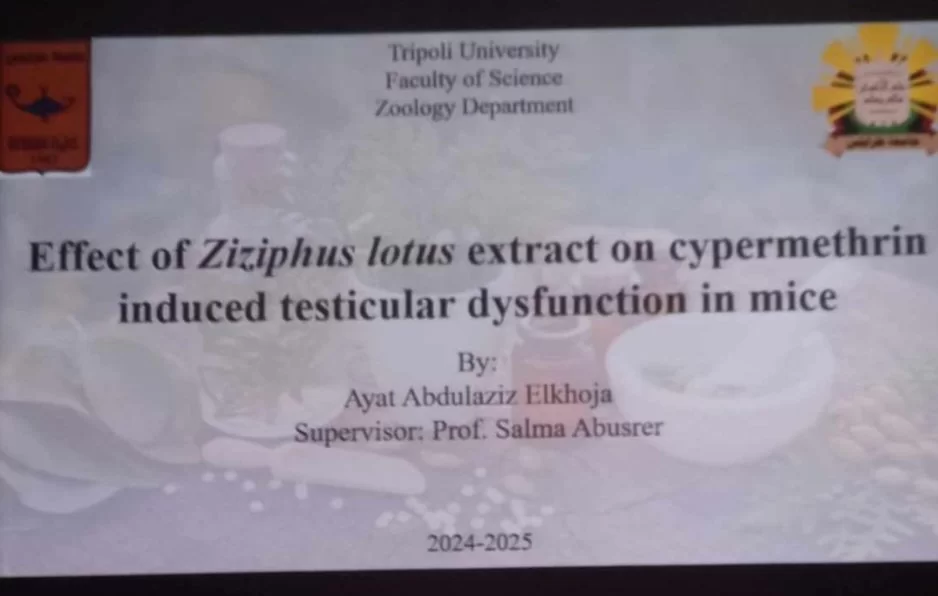 بتوفيق من الله عز وجل تمت مناقشة رسالة الإجازة العالية (الماجستير) اليوم الإثنين الموافق 2024/10/7 على تمام الساعة الحادية عشر المقدمة من الطالبة : أيات عبد العزيز محمود الخوجةبعنوان Effect of Ziziphus lotus extract On Cypermethrin indu