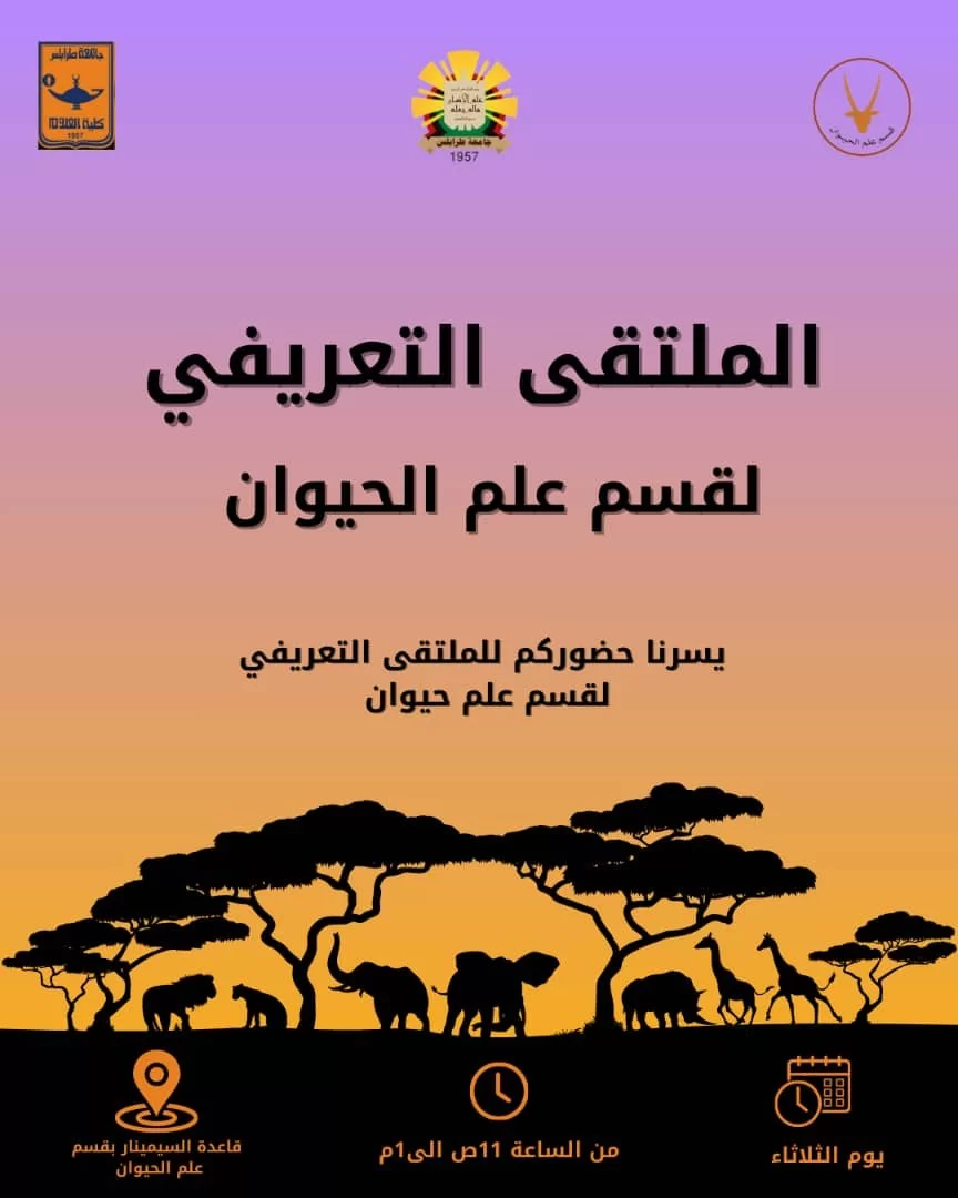من ضمن نشاطات قسم علم الحيوان :تتشرف لجنة النشاط بقسم علم الحيوان بإقامة الملتقى التعريفي للقسم الذي يستهدف الطلاب الجدد و المقبلين على الدراسة بالقسم و طلابه الاعزاء .و في هذا الصدد ندعوكم لحضور هذا الملتقى الذي سيقام يوم الغد الثلاثاء الموافق 2024/7/2 على تمام الساعة 11 صباحاً بقا