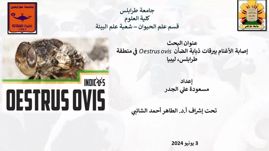 بتوفيق من الله عز وجل تمت مناقشة رسالة الإجازة العالية (الماجستير) اليوم الإثنين الموافق 2024/6/3 على تمام الساعة الثانية عشر المقدمة من الطالبة :مسعودة علي الجدر بعنوان إصابة الأغنام والماعز بيرقات Oestrus ovis في منطقة طرابلس ،